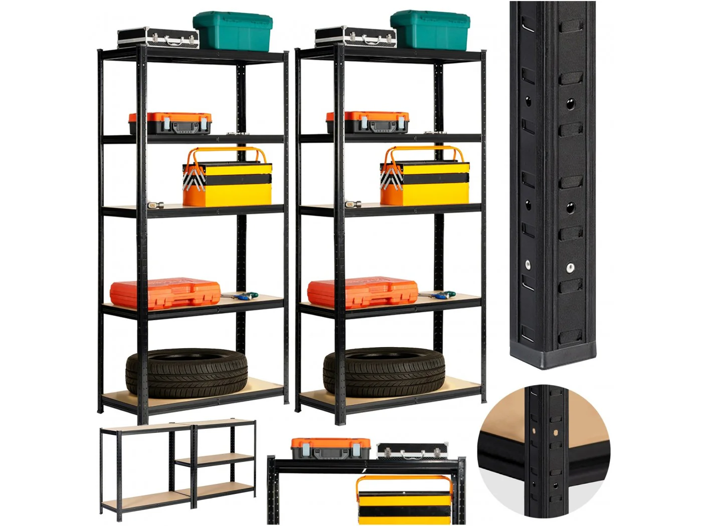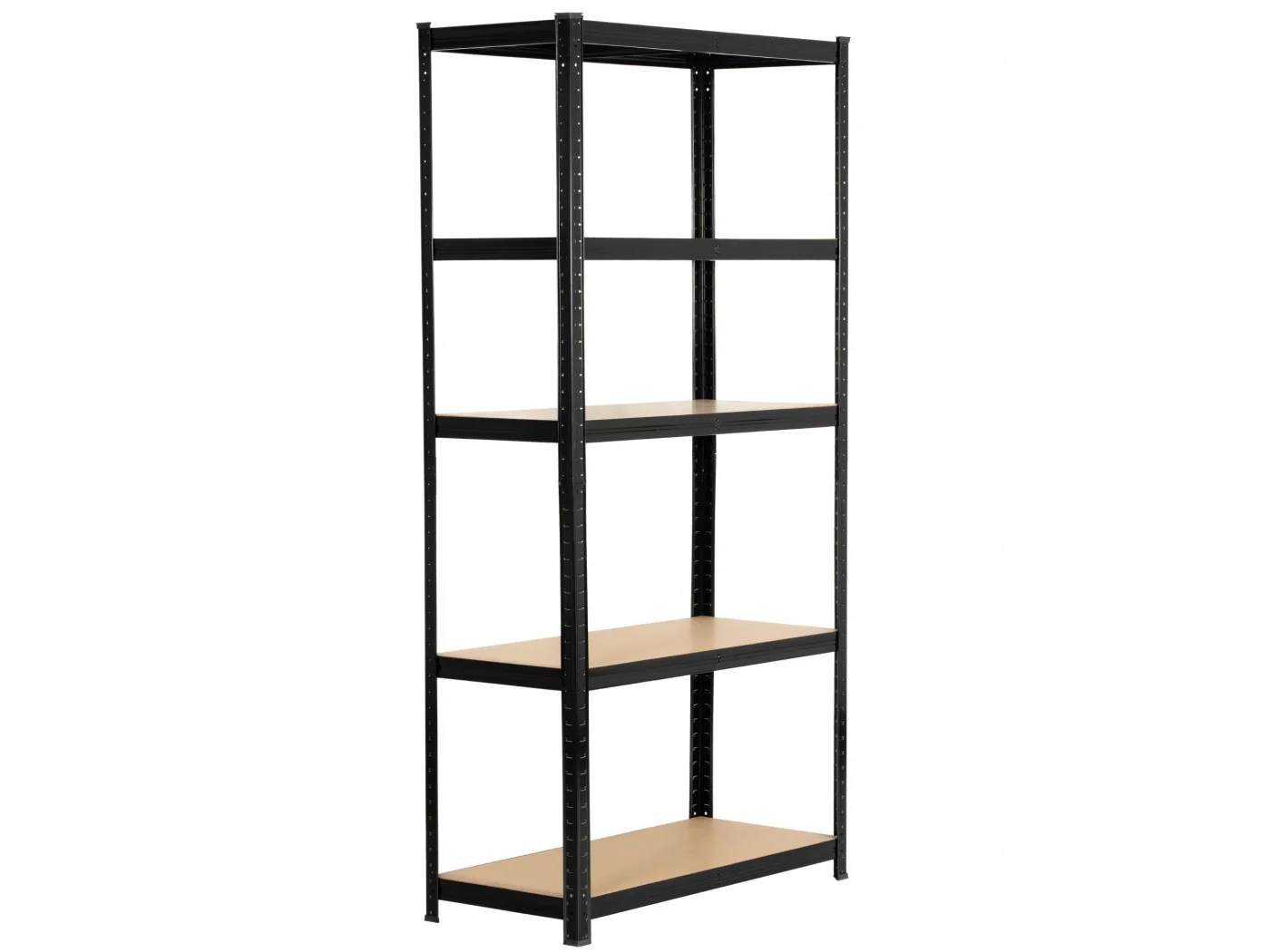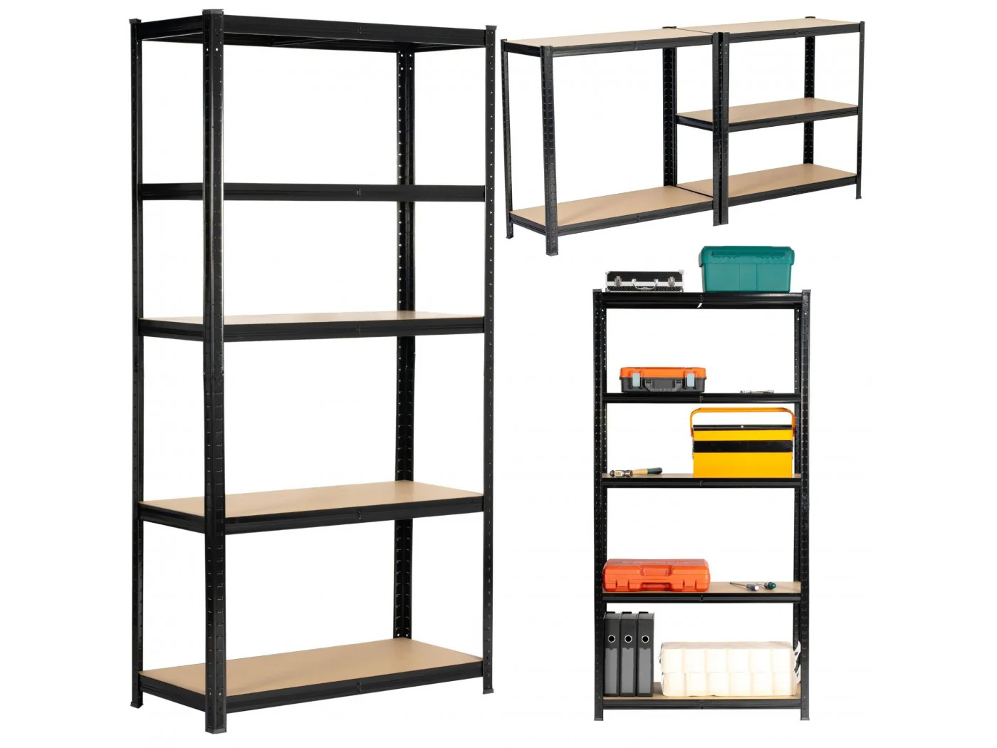 Zestaw regałów metalowy idealnie pasujący do przechowywania. Nadaje się do garażu, warsztatu, komórki lokatorskiej, jak również do pomieszczeń gospodarczych. Regał w kolorze czarnym o szerokości 80 cm oraz 180 wysokości. Pólki wykonane z wytrzymałej płyty MDF. Nośność na półkę wynosi 175kg.