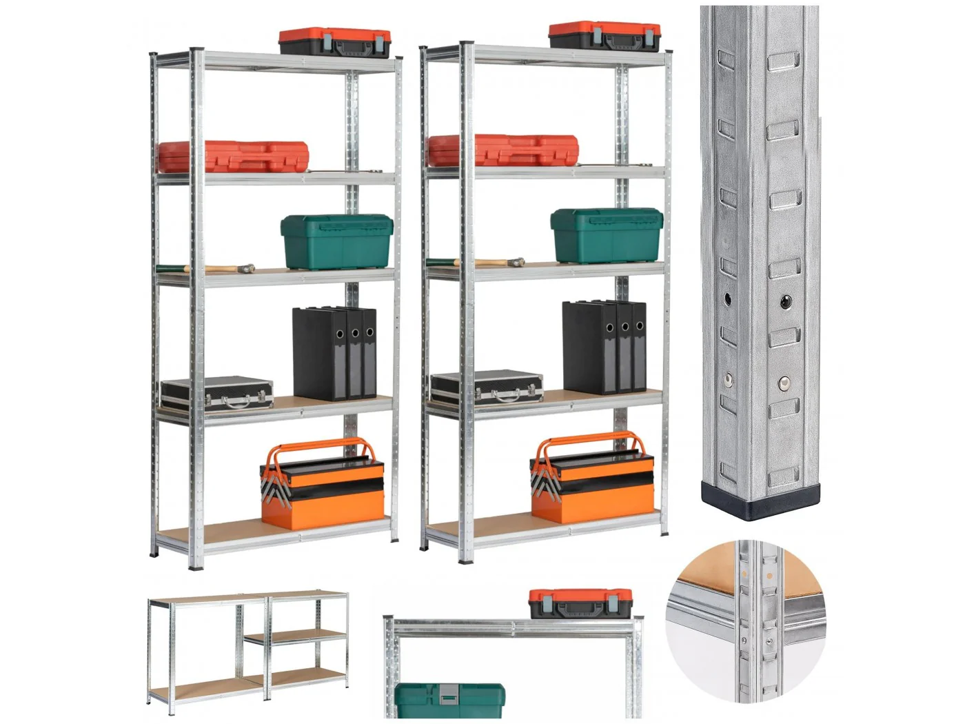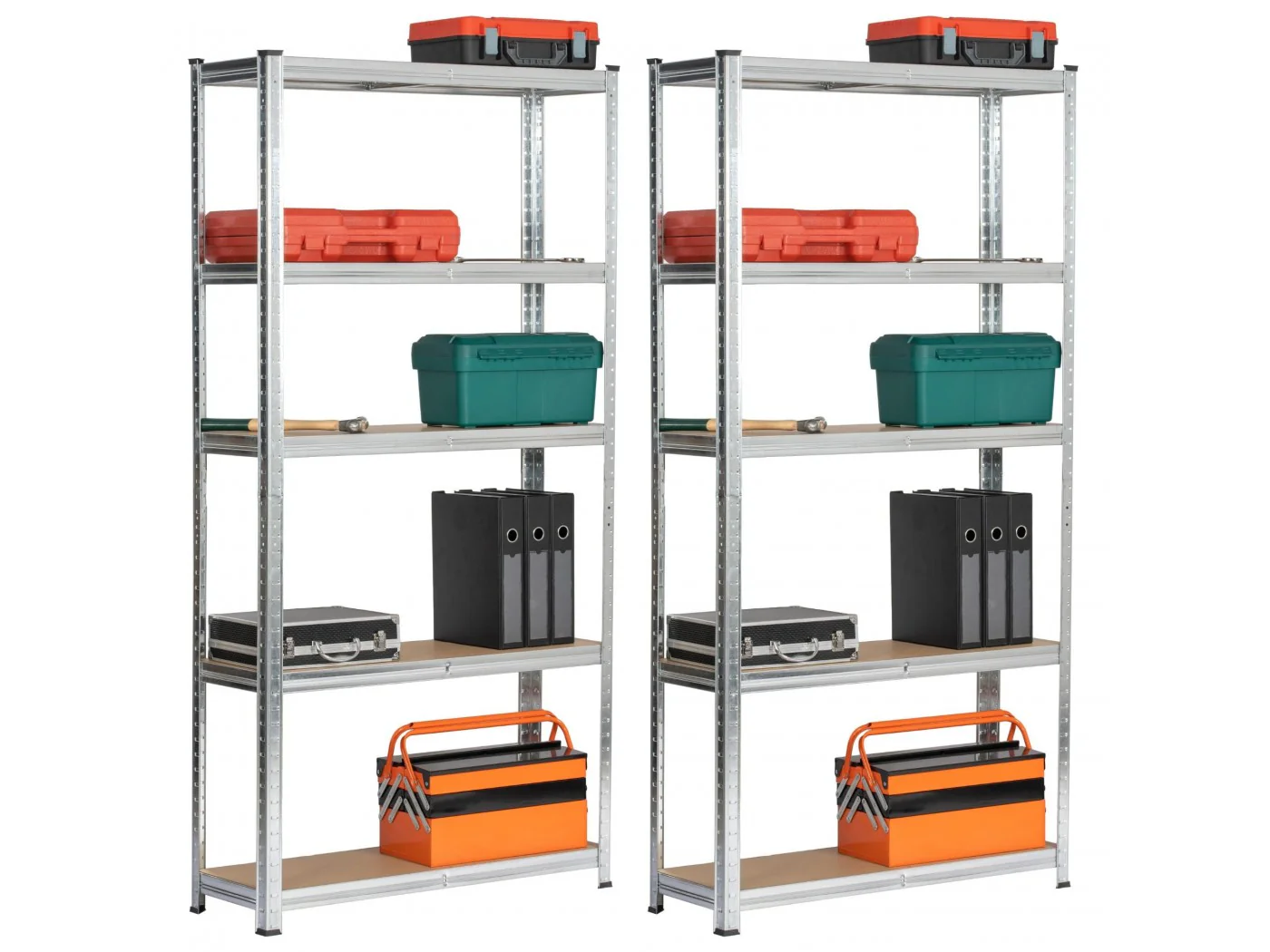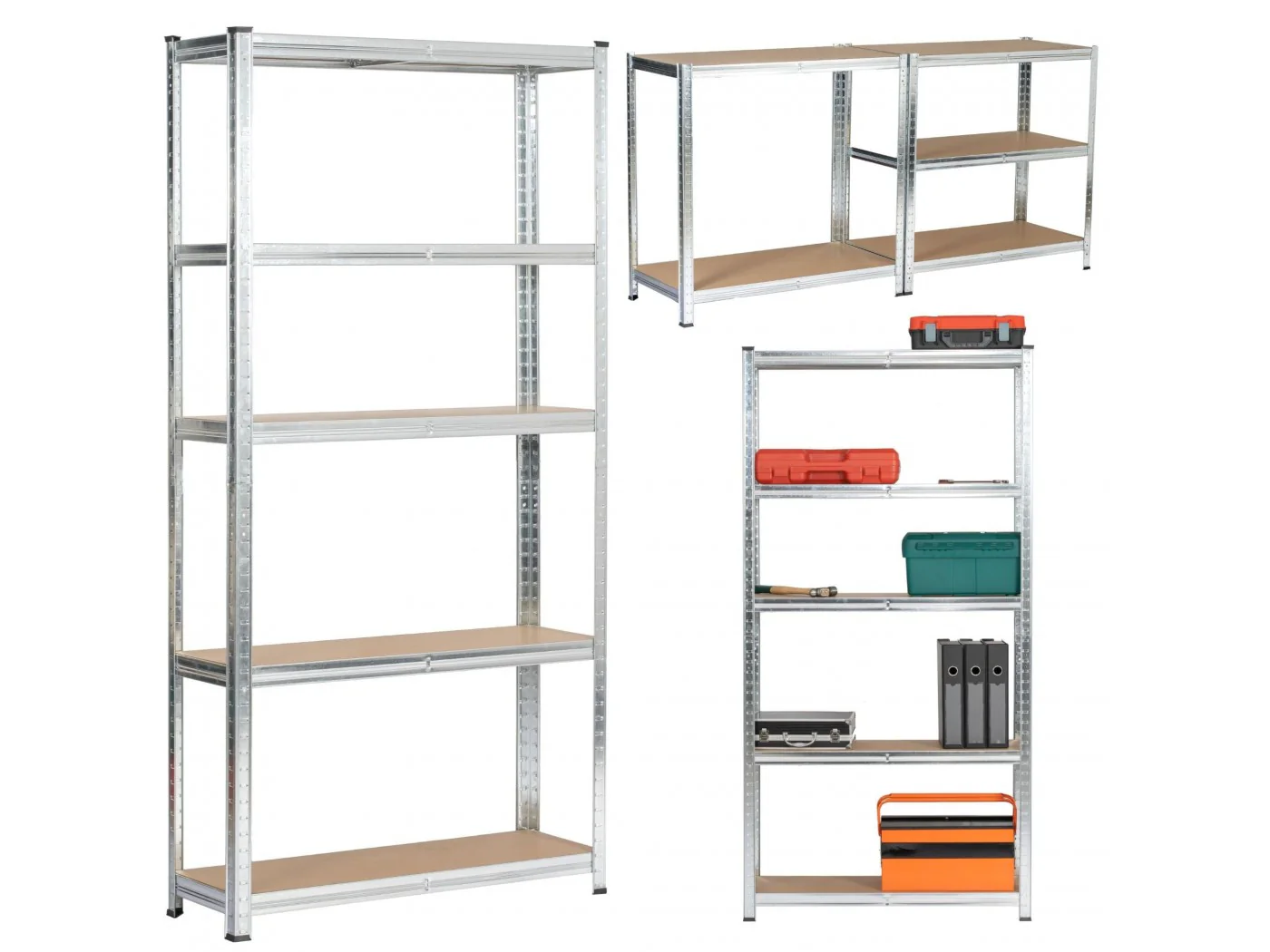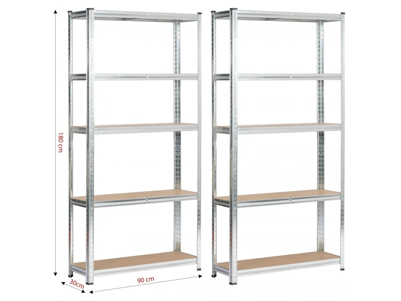 Zestaw regałów metalowy idealnie pasujący do przechowywania. Nadaje się do garażu, warsztatu, komórki lokatorskiej, jak również do pomieszczeń gospodarczych. Regał w kolorze srebrny o szerokości 90 cm oraz 180 wysokości. Pólki wykonane z wytrzymałej płyty MDF. Nośność na półkę wynosi 175kg.