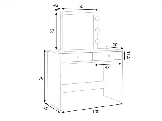 Toaletka kosmetyczna w stylu Hollywood. Niezbędnik każdej kobiety, chcącej mieć swoją własną przestrzeń w domu, mieszkaniu, czy profesjonalnym salonie kosmetycznym. Dwie szuflady pomieszczą wszelkie niezbędne do makijażu akcesoria. Żarówki LED w białej, zimnej barwie, sprawią, że wykonanie makijażu będzie łatwiejsze i przyjemniejsze.