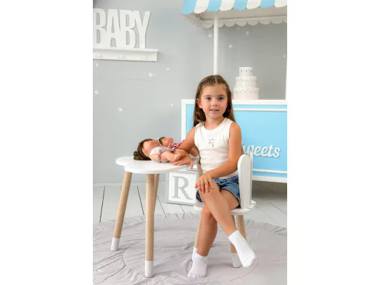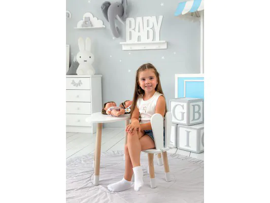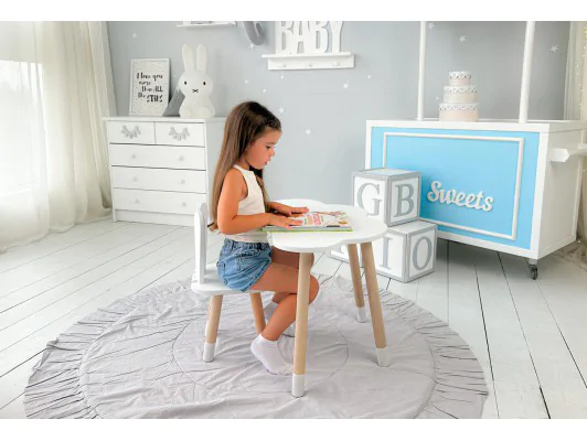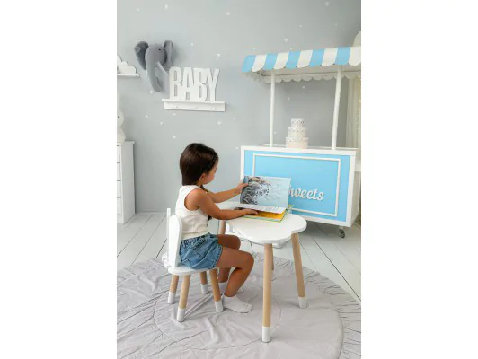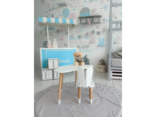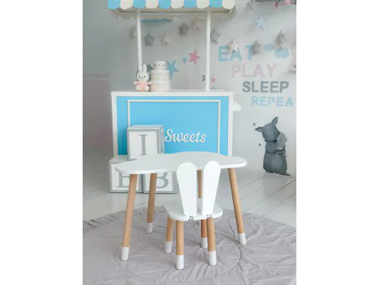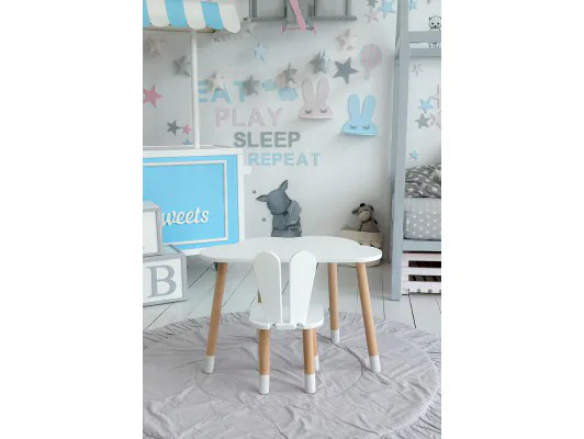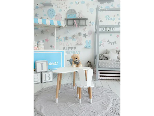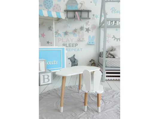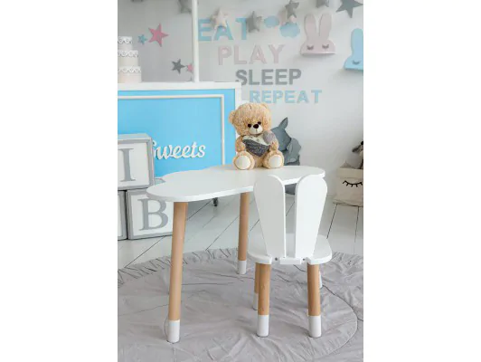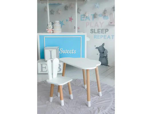 Biały stolik Króliś dziecięcy w kształcie chmurki z krzesełkiem z uszami zajączka