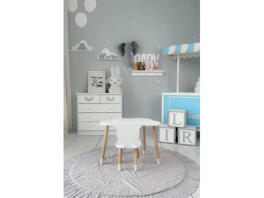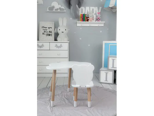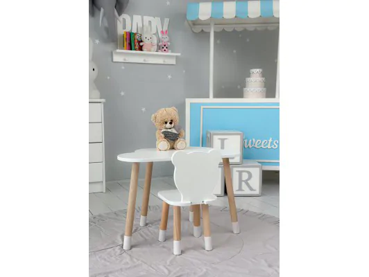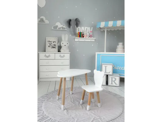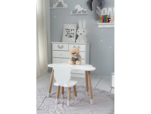 Stolik dla dziecka Misio w kształcie chmurki, w zestawie z krzesełkiem z oparciem w kształcie misia.