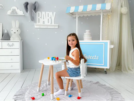 Stwórz magiczny kącik dla swojego dziecka dzięki naszemu uroczemu zestawowi mebli! Stolik w kształcie chmurki i krzesełko z oparciem w formie misia to doskonałe połączenie funkcjonalności i designu, które zachwyci zarówno dzieci, jak i rodziców.
