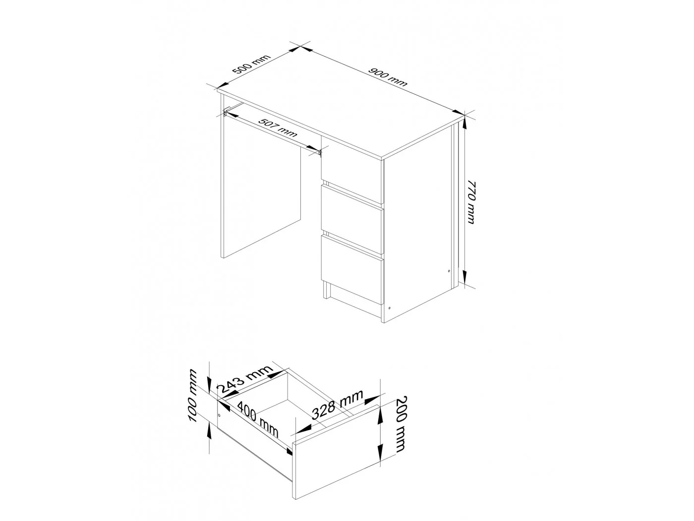 Wykonane z płyty laminowanej biurko to produkt charakteryzujący się dużą odpornością na ścieranie, dzięki czemu będzie w stanie służyć w idealnym stanie przez długi czas. Jego uniwersalny wygląd sprawia, że bardzo dobrze będzie prezentowało się w każdym pomieszczeniu. Mebel został wyposażony w blat, wysuwaną półkę oraz trzy pojemne szuflady, które można zagospodarować według indywidualnych potrzeb.