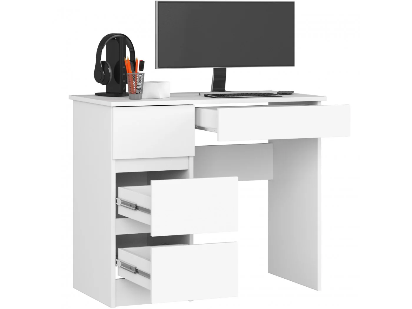 Biurko wyposażone zostało w cztery praktyczne szuflady, które sprawnie i cicho poruszają się na metalowych prowadnicach kulkowych, dzięki czemu bardzo łatwo się je otwiera i zamyka. Fronty szuflad prezentują się elegancko, ponieważ także zostały wykonane z płyty laminowanej w białym kolorze. Umieszczone zostały one po lewej stronie, co jest praktycznym i funkcjonalnym rozwiązaniem.