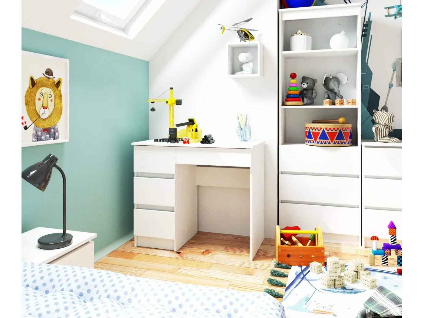 Szuflady te zapewniają dużą ilość przestrzeni do zagospodarowania, natomiast na blacie o długości 90 cm oraz szerokości 50 cm, z łatwością zmieści się laptop lub monitor komputera stacjonarnego, przybory do pisania oraz inne potrzebne do nauki przedmioty. Wysokość 77 cm pozwoli na wygodną naukę, zarówno dzieciom z młodszych, jak i starszych klas. Dzięki swoim wymiarom biurko jest także ustawne i zmieści się nawet w mniejszych pokojach.