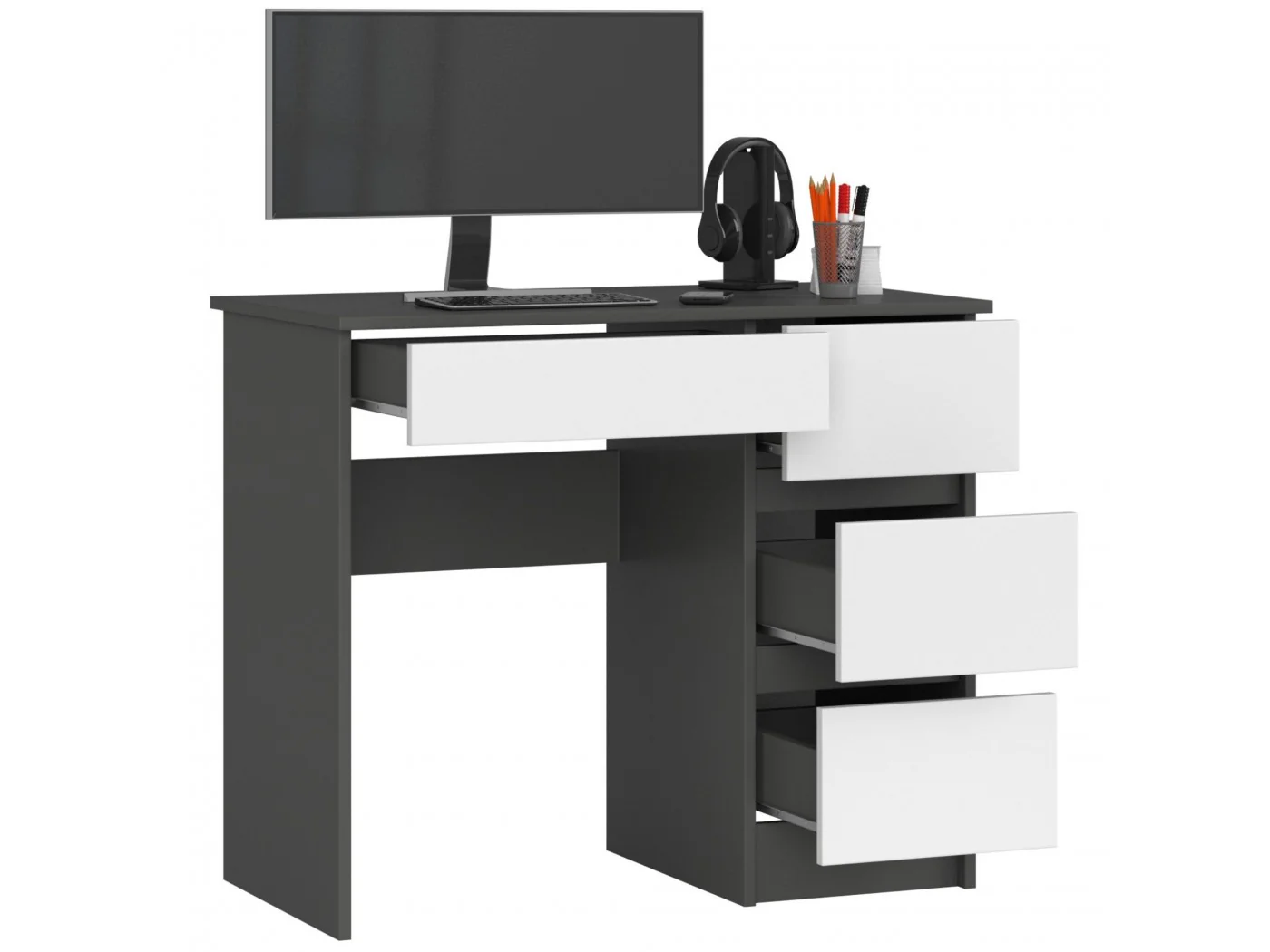 Biurko komputerowe A-7 to niewielkich rozmiarów mebel, który znajdzie zastosowanie w małym pomieszczeniu - biurowym lub mieszkalnym. Sprawdzi się na przykład w domowym gabinecie lub pokoju dziecięcym/młodzieżowym. Prezentowany produkt łączy w sobie dwa kontrastujące, ale świetnie uzupełniające się kolory grafit szary oraz biel. Składa się z trzech szuflad przeznaczonych do dowolnego zagospodarowania. Prosty w swej formie, jednak niezwykle funkcjonalny mebel z pewnością zostanie doceniony przez osoby, które pragną stworzyć kącik do pracy lub nauki, jednak nie mają do dyspozycji wiele miejsca.