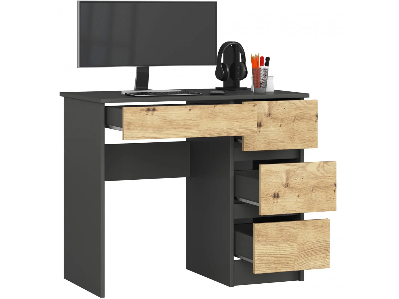Biurko komputerowe A-7 to niewielkich rozmiarów mebel, który znajdzie zastosowanie w małym pomieszczeniu - biurowym lub mieszkalnym. Sprawdzi się na przykład w domowym gabinecie lub pokoju dziecięcym/młodzieżowym. Prezentowany produkt łączy w sobie dwa kontrastujące, ale świetnie uzupełniające się kolory grafit szary oraz dąb artisan. Składa się z trzech szuflad przeznaczonych do dowolnego zagospodarowania. Prosty w swej formie, jednak niezwykle funkcjonalny mebel z pewnością zostanie doceniony przez osoby, które pragną stworzyć kącik do pracy lub nauki, jednak nie mają do dyspozycji wiele miejsca.