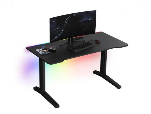 Biurko gamingowe na stelażu w kształcie litery L z systemem cable management, ergonomicznym blatem z listwą LED w kolorach RGB oraz przelotką na kable.