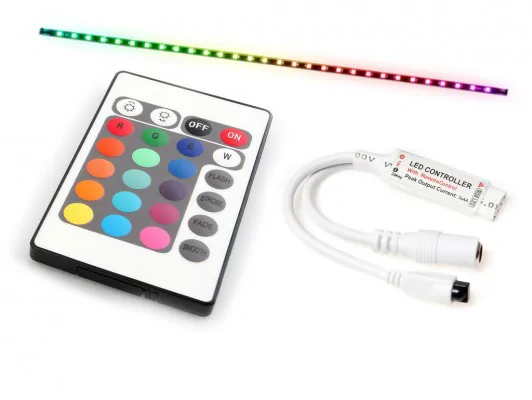 Podświetlenie sterowane jest za pomocą bezprzewodowego pilota (sterowanego na podczerwień), całość zasilana jest prądem z gniazdka (dostarczamy bezpieczny zasilacz typu plug-in).