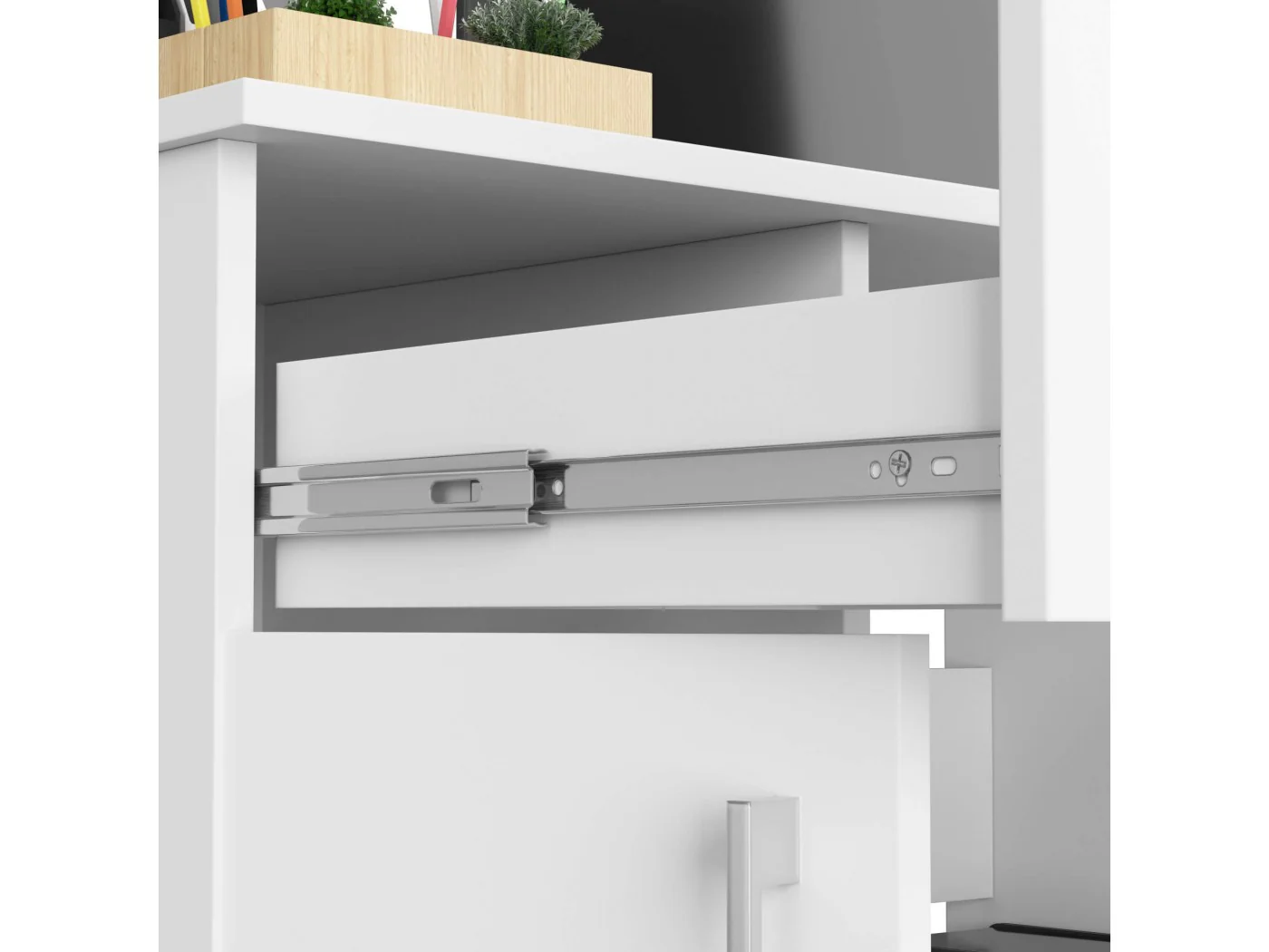 - Szuflady i półka pod klawiaturę poruszają się na metalowych prowadnicach kulkowych