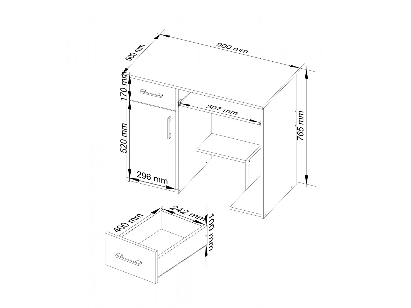 Biurko ma 90 cm długości, dlatego bez problemu można ustawić na nim komputer oraz zagospodarować pozostałą przestrzeń w wybrany sposób. Stosunkowo niewielkie wymiary sprawiają, że biurko będzie idealnie pasowało zarówno do dużych, jak i małych pomieszczeń. Świetnie sprawdzi się w gabinecie, pokoju młodzieżowym lub pokoju przystosowanym do pracy. Szuflady i półka pod klawiaturę poruszają się na metalowych prowadnicach kulkowych, co daje ogromną wygodę użytkowania. Biurko komputerowe zostało wykonane w solidny i staranny sposób.