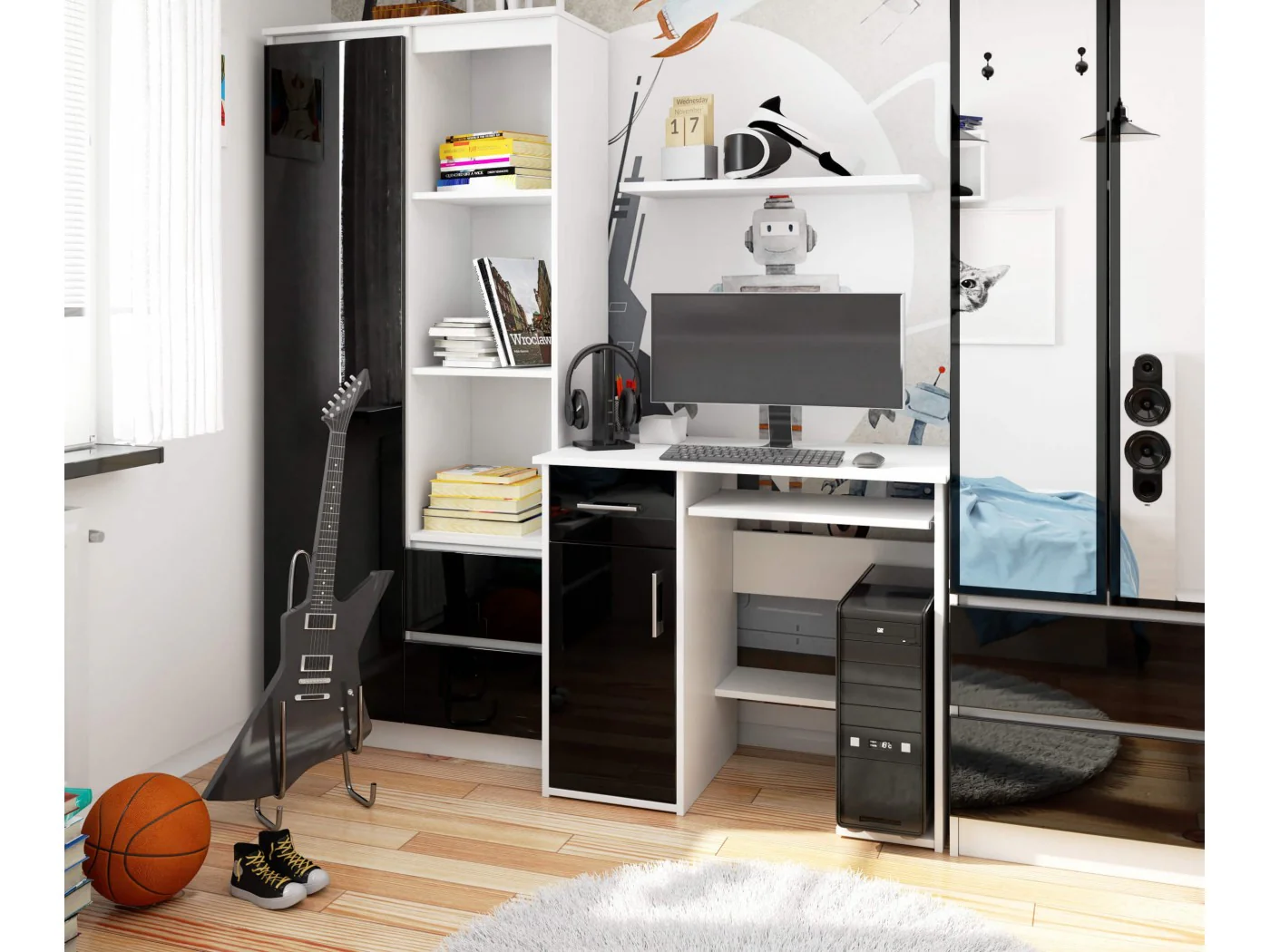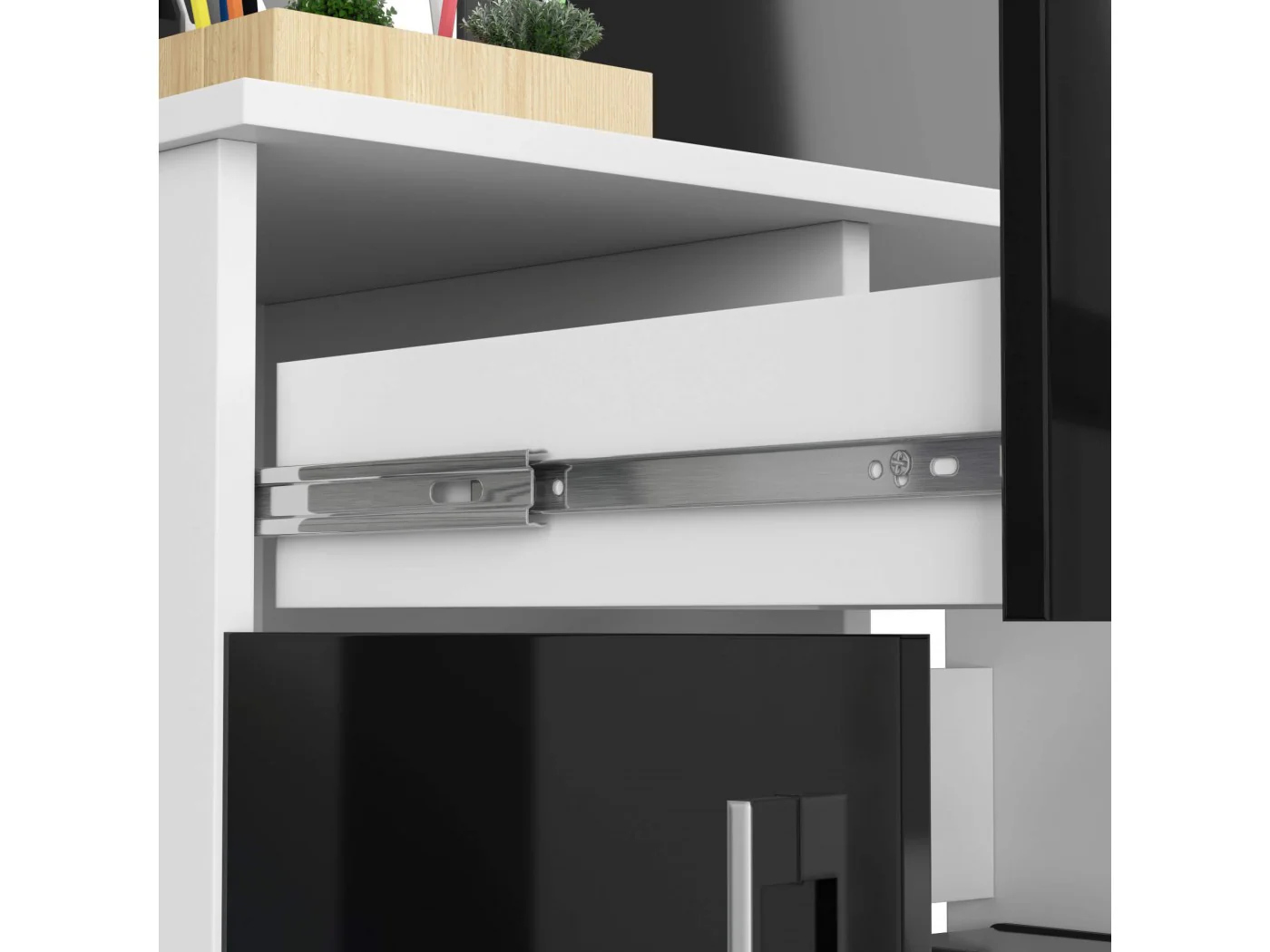Eleganckie biurko komputerowe JAY wykonane zostało z najwyższej jakości materiałów. Przygotowane, aby w wygodny sposób pomieścić komputer, monitor oraz najbardziej potrzebne przedmioty. Białe biurko połączone zostało z czarnymi frontami szafek, wykonanych z połyskującego materiału. Kontrastu dodają srebrne uchwyty do szuflad i drzwiczek. Miłośnicy minimalizmu oraz elegancji na pewno docenią takie rozwiązanie.
