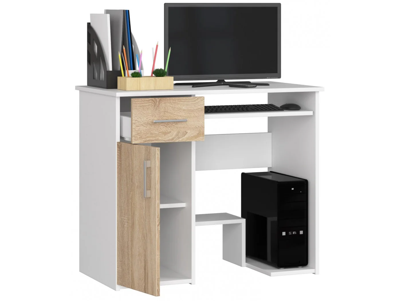Biurko komputerowe JAY wykonano z płyty meblowej laminowanej, odpornej na ścieranie, w dwóch kolorach. Surowy pod względem stylistycznym, biały blat biurka świetnie współgra z ciepłymi optycznie frontami szuflady i drzwiczek o barwie dębu sonoma. Całość wykończono w macie. Po prawej stronie mebla znajduje się miejsce do pracy z wysuwaną półką na klawiaturę nieco poniże blatu. Bliżej podstawy mebla znajduje się kolejna półka i jeszcze jedna, przeznaczona na obudowę komputera PC. Lewa strona biurka to szuflada na metalowych prowadnicach rolkowych usytuowana tuż pod blatem. Pod nią znajduje się szafka z dwiema półkami i uchylnymi drzwiczkami.
