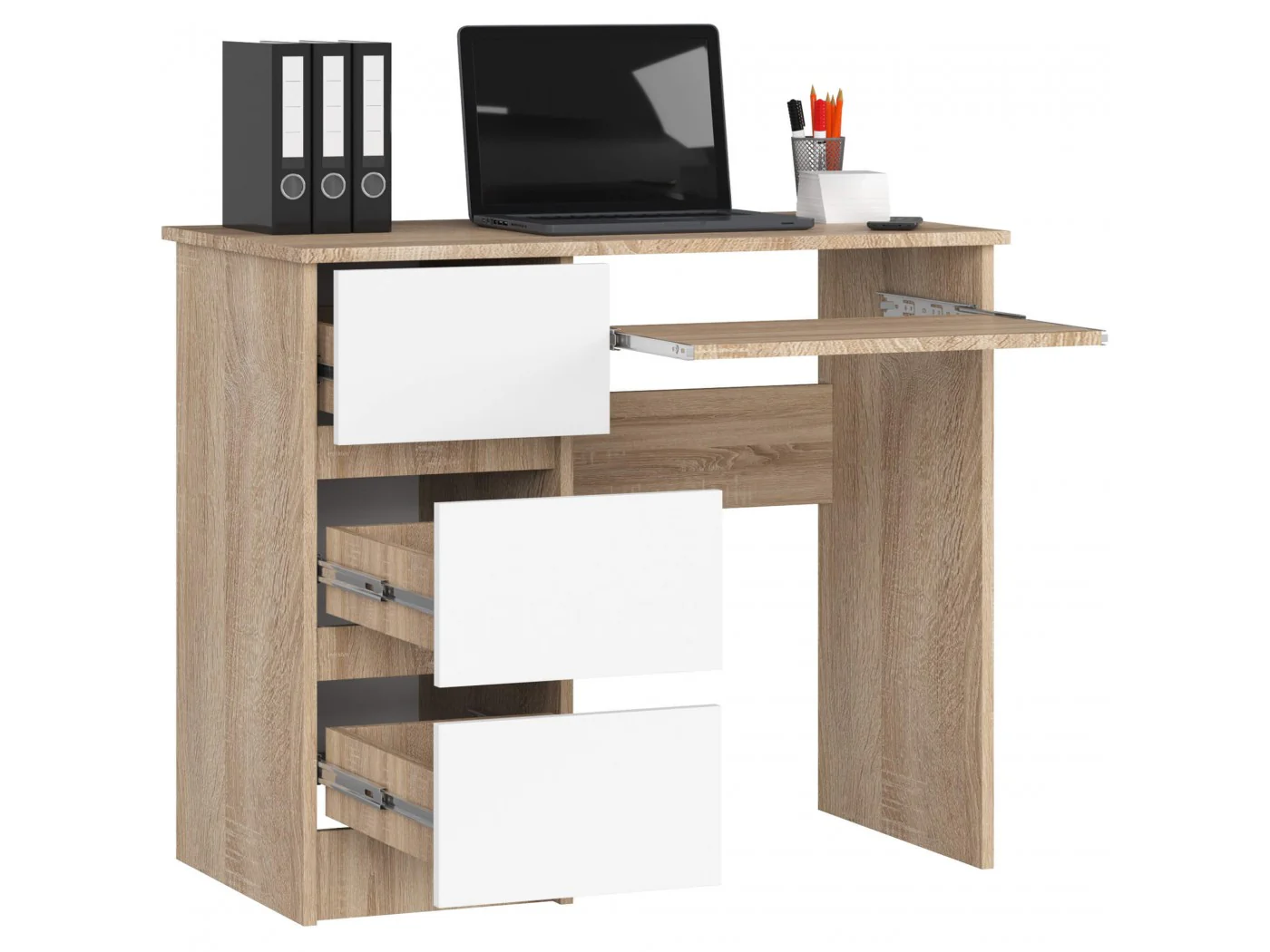 Biurko posiada 3 pojemne szuflady zapewniają wiele przestrzeni do zagospodarowania. Umieszczone są po lewej stronie biurka. Pod blatem znajdziemy specjalną półkę pod klawiaturę komputerową, która tak jak szuflady, porusza się na metalowych prowadnicach kulkowych.