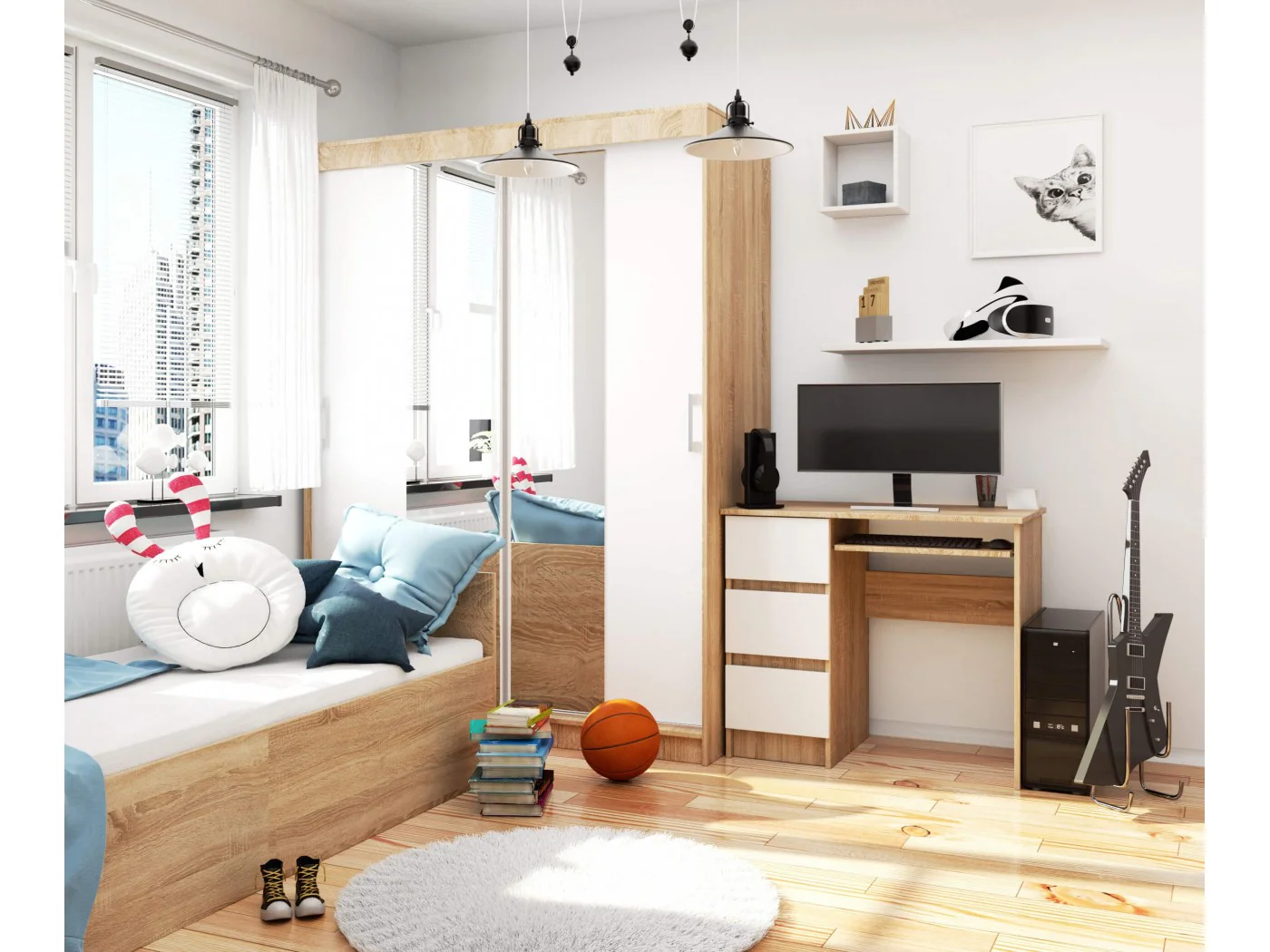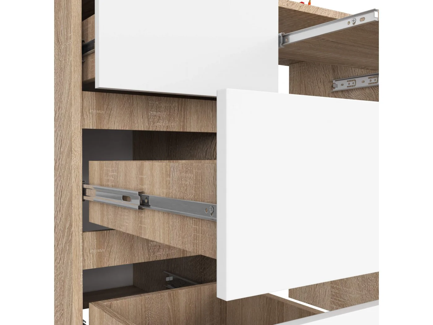 kolorem przewodnim jest tu barwa dębu sonoma, harmonijnie współgrająca z białymi frontami szuflad.