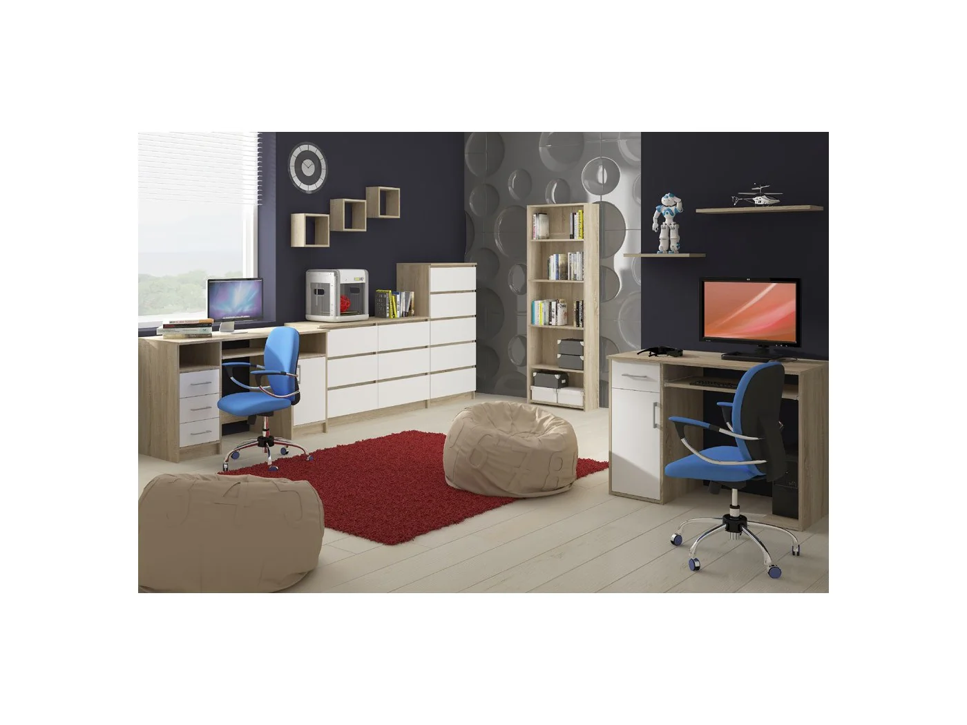 Biurko to mebel, którego nie może zabraknąć w żadnym pokoju dziennym oraz młodzieżowym. Jest praktyczne, zajmuje niewiele miejsca, a może służyć zarówno do pracy lub nauki, jak i rozrywki. Doskonale sprawdza się również w domowych gabinetach, a także przestrzeni biurowej. Wśród przygotowanego przez nas asortymentu mogą Państwo znaleźć wiele interesujących biurek zaprojektowanych w funkcjonalny i nowoczesny sposób. Jedną z propozycji jest biurko komputerowe A-6 (prawe), które sprosta oczekiwaniom nawet najbardziej wymagających klientów. To produkt wysokiej jakości, który wykazuje dużą odporność na uszkodzenia oraz ewentualne zarysowania. Dzięki temu może być stosowany w pomieszczeniach o dużym natężeniu ruchu. Na biurko składają się trzy niezwykle pojemne szuflady, a także wysuwana na prowadnicach rolkowych półka. Całość została utrzymana w dwóch modnych i ponadczasowych kolorach, do których należy dąb sonoma i biel.