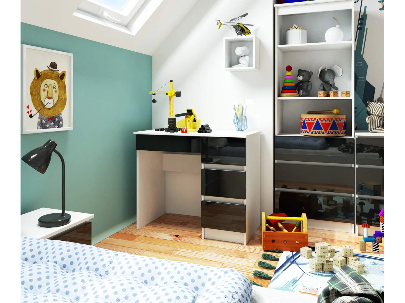 Czerń i biel to dwa ponadczasowe kolory, które doskonale łączą się zarówno ze sobą nawzajem, jak i z wszelkimi innymi barwami. Właśnie dlatego niezmiennie od lat są wykorzystywane w wielu aranżacjach wnętrz. Szczególnie dobrze pasują do pokojów młodzieżowych. Prezentowany model A-7 90 cm. (prawe) to biurko niewielkich rozmiarów, które stanowi połączenie białego korpusu oraz czarnych frontów w wysokim połysku. Interesująca kompozycja na pewno przypadnie do gustu miłośnikom minimalizmu, uniwersalnej kolorystyki i prostych brył.