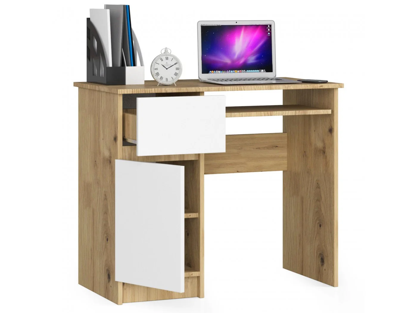 Biurko komputerowe PIKSEL wykonane zostało z płyty meblowej laminowanej w dwóch kolorach. Korpus i blat mebla oraz tylną blendę utrzymano w kolorze dąb artisan, natomiast front szuflady i szafki to kolor biały. Wszystkie powierzchnie mebla są matowe. Część do pracy znajduje się po prawej stronie biurka, gdzie pod blatem zamocowana została wysuwana szuflada na klawiaturę. Z kolei lewa strona mebla jest całkowicie zabudowana. Tuż pod blatem znajduje się pojedyncza szuflada, a niżej – szafka zamykana skrzydłem drzwi, wyposażona w dwie półki. Zarówno szuflada, jak i półka na klawiaturę wysuwają się dzięki metalowym prowadnicom rolkowym.