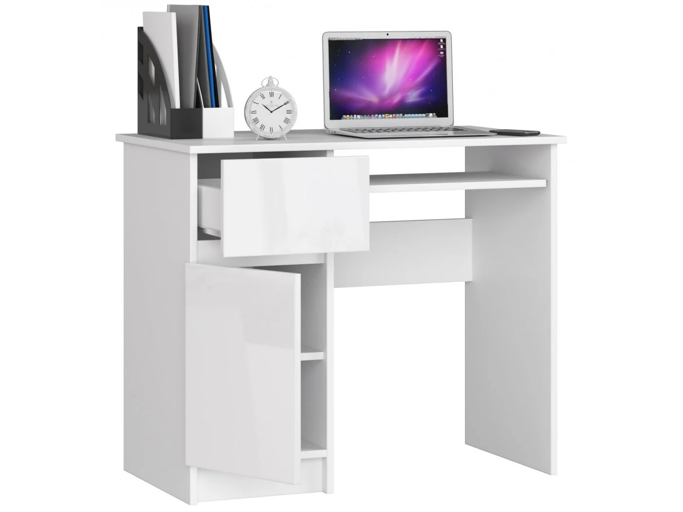 Biurko komputerowe PIKSEL zostało wykonane z dobrej jakościowo białej płyty laminowanej, która ma wysoką odporność na ścieranie. A fronty zrobiono z białej płyty z połyskiem. Dzięki tak uniwersalnemu kolorowi otrzymujemy nowoczesny mebel. Solidna konstrukcja biurka daje nam gwarancję jego długiej żywotności, a dodatkowo krawędzie zabezpieczone okleiną ABS są odporne na obicia i zachlapania. Na blacie biurka możemy swobodnie postawić monitor komputera, zaś klawiaturę położyć na wysuwanej półce. Szuflada i pojemna szafka boczna z półką są idealnym miejscem do przechowywania zeszytów i książek, a nawet segregatorów. Biurko PIKSEL jest nowoczesne rozwiązaniem, które idealnie wpasowuje się w niewielkie przestrzenie, tj. pokój dziecięcy, hotelowy, gabinet czy niewielkie biuro.
