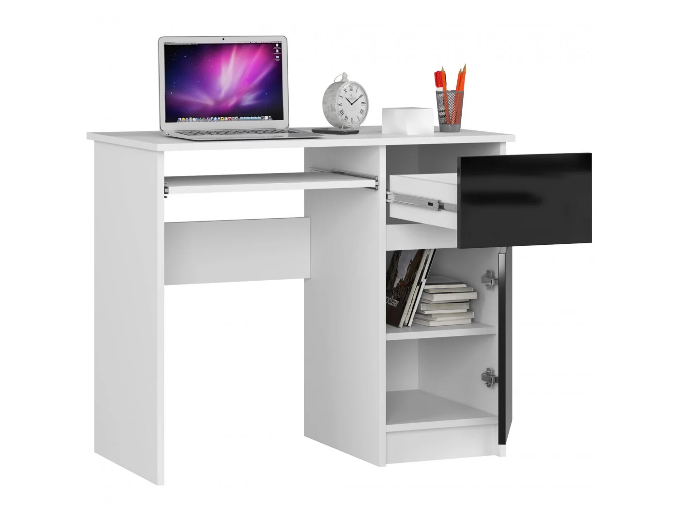 Biurko komputerowe PIKSEL dzięki klasycznemu zestawieniu kolorystycznemu: białego i czarnego z połyskiem, jest wyróżniającym się nowoczesnym meblem. Biurko zostało wykonane z dobrej jakościowo płyty laminowanej odpornej na ścieranie. Jego prosta i solidna konstrukcja zabezpieczona obrzeżem ABS gwarantuje długą żywotność mebla. Na blacie biurka mamy odpowiednią ilość przestrzeni, by ustawić na nim monitor komputera, zaś na klawiaturę przewidziano osobną, wysuwaną półkę. Szuflada i pojemna szafka boczna z półką są idealnym miejscem do przechowywania. Biurko idealnie wpasowuje się w niewielkie przestrzenie, jak np. pokój dziecięcy, gabinet domowy czy niewielkie biuro.