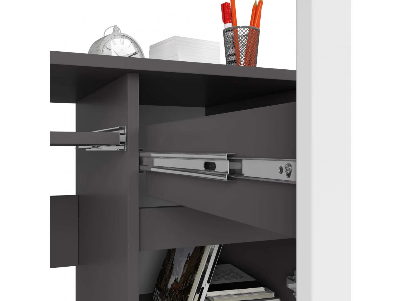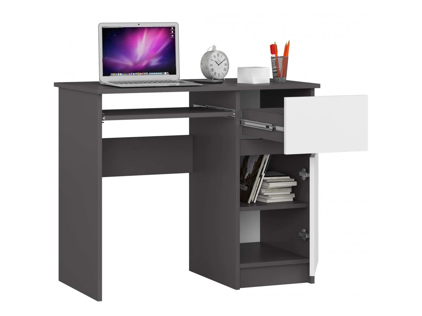 Biurko wolnostojące PIKSEL 90 cm w kolorach GRAFIT SZARY/BIAŁE jest idealnym rozwiązaniem dla małych wnętrz. Bardzo dobrze sprawdzi się w roli biurka szkolnego lub komputerowego. Jego ergonomiczna konstrukcja zapewnia komfort użytkowania. Biurko zostało wyposażone w wysuwaną półkę na klawiaturę, podręczną szufladę boczną oraz szafkę z półką, w której swobodnie mogą stanąć segregatory i książki. Do wykonania biurka użyto przyjemnej w dotyku i łatwej w utrzymaniu matowej płyty pokrytej odporną na ścieranie warstwą laminatu. Całości dopełniają poręczne uchwyty w srebrnym kolorze.