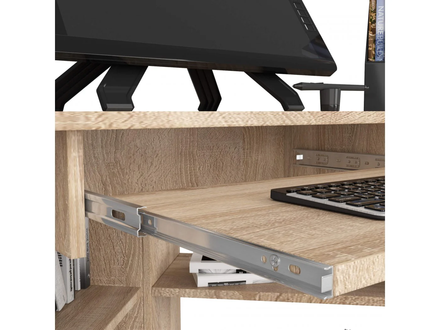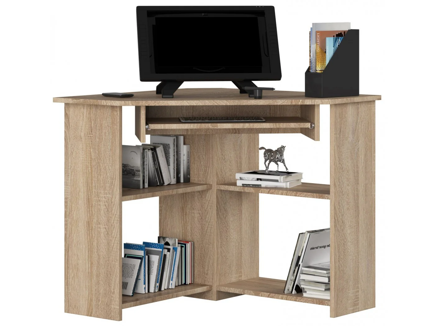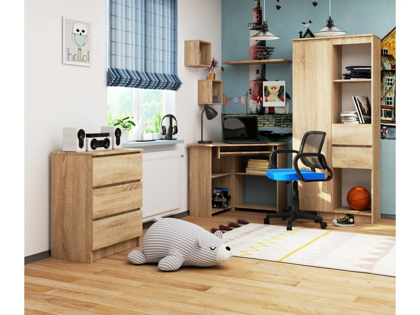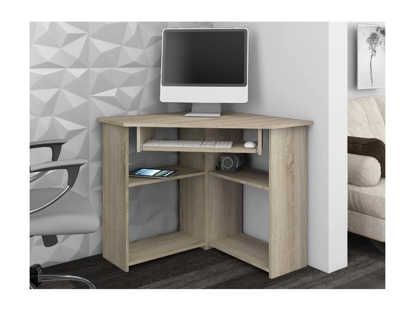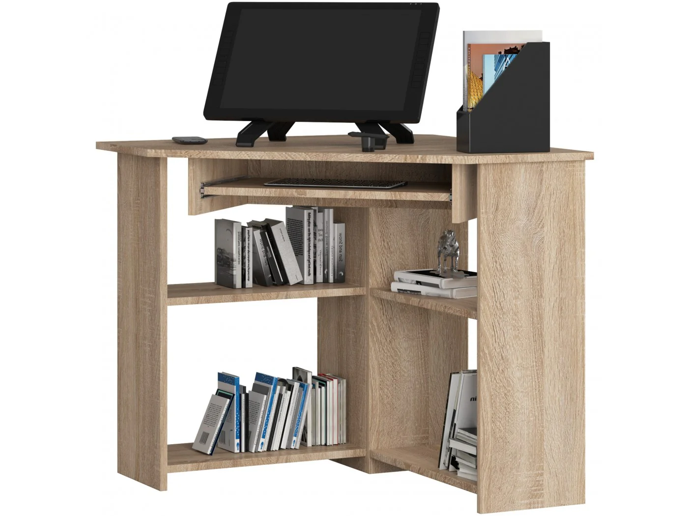 Biurko narożne, które pozwoli w stu procentach zagospodarować wolne miejsce w pokoju. Spełni się w pomieszczeniach dla dziecka, jako element biura w domu czy firmie. Proponowany egzemplarz stworzono z niezawodnej płyty laminowanej o grubości 16 milimetrów. Dla zwiększenia wytrzymałości i tak już trwałej konstrukcji postawiono na obrzeża ABS na widocznych krawędziach. Model ma sporo wolnej przestrzeni do dowolnego zagospodarowania. W konstrukcji znalazła się półka na klawiaturę wysuwana na metalowych prowadnicach kulkowych oraz cztery półki na książki, akcesoria czy sprzęt.