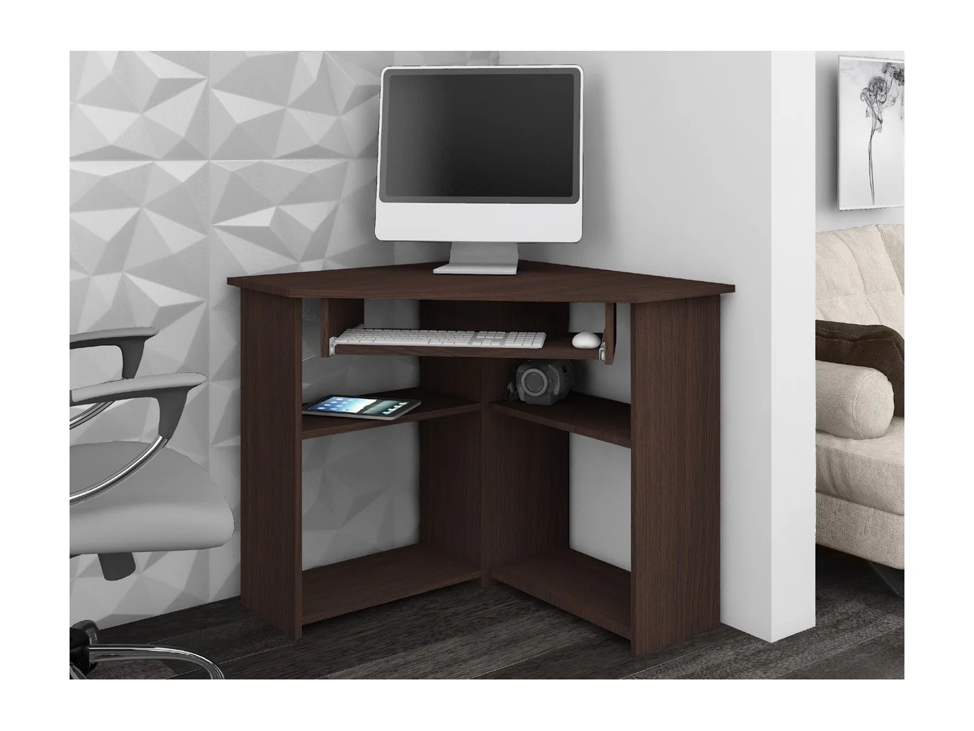 Zagospodarowanie niewielkiej przestrzeni nie jest łatwe. Wymaga znalezienia odpowiednich mebli, które cechują się niebywałą funkcjonalnością. Taką propozycją jest narożne biurko komputerowe dostępne w kolorze wenge, które z pewnością sprosta oczekiwaniom osób stojących przed zadaniem zaaranżowania małej przestrzeni biurowej. Biurko, które proponujemy, to wyrób wysokiej jakości, który pozytywnie zaskoczy trwałością, wytrzymałością i odpornością na zarysowania. Ponadto charakteryzuje się pięknym wyglądem, pozwalając na niewielkiej przestrzeni zmieścić zarówno komputer, jak i wiele akcesoriów biurowych. Oprócz blatu zostało wyposażone w odkryte półki, a także wysuwaną półkę na klawiaturę. Biurko wraz z instrukcją dostępną w opakowaniu przeznaczone jest do samodzielnego montażu. To produkt, który cieszy się ogromnym zainteresowaniem ze strony naszych klientów, łącząc w sobie uniwersalny wygląd oraz praktyczne zastosowanie. Zapraszamy do skorzystania ze świadczonych przez nas usług i zakupu biurka.