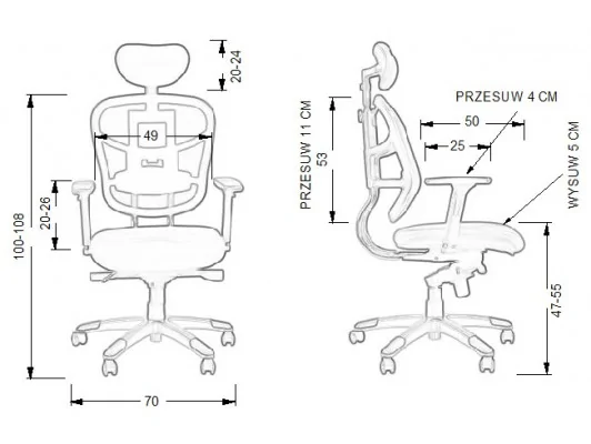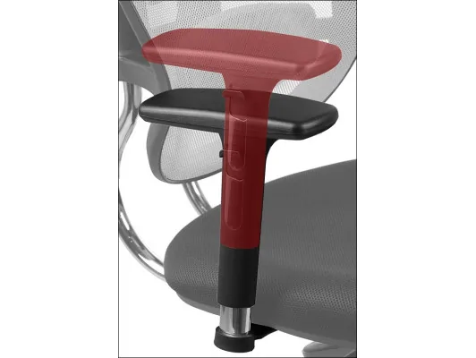 Podłokietniki regulowane (góra-dół, przód-tył, na boki) z miękkimi, poliuretanowymi nakładkami.