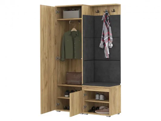 Nowoczesny funkcjonalny komplet do przedpokoju dostępny w 3 wersjach kolorystycznych oraz trzema kolorami siedzisz i paneli.