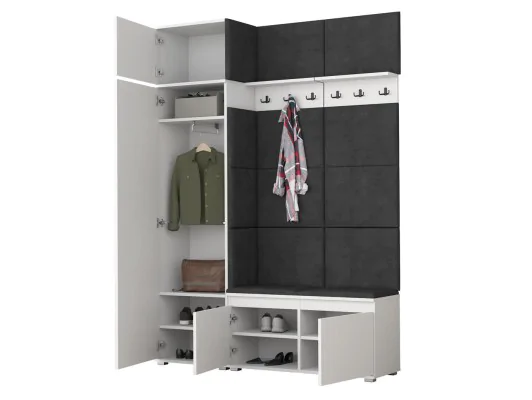 Nowoczesny funkcjonalny komplet do przedpokoju dostępny w 3 wersjach kolorystycznych oraz trzema kolorami siedzisz i paneli.