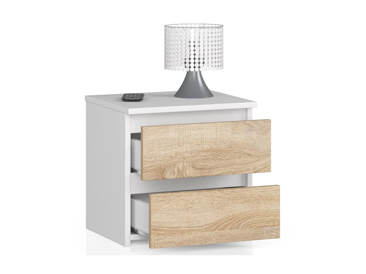 Szafki nocne to przydatne meble, które ustawia się obok łóżka. Można w nich umieścić przedmioty, które ułatwiają odpoczynek oraz sen. Na ich blacie obowiązkowo znajduje się lampka. Jaki model mebla wybrać? Ciekawą propozycją jest biała komoda CL2 40cm z frontami szuflad w kolorze sonoma. Świetnie sprawdzi się ona w sypialni oraz pokoju młodzieżowym.