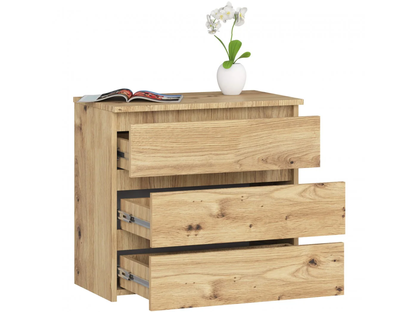 Komoda dąb artisan posiada 3 wygodnie otwierane szuflady. Znakomicie się sprawdzi do sypialni jako nieodzowny element jej wyposażenia. W szufladach można przechowywać bieliznę, akcesoria kosmetyczne czy komplet pościeli na zmianę. Blat idealnie się nada do ustawienia lampki nocnej i położenia zajmującej lektury. Mebel można postawić także w pokoju dziecka i w sypialni nastolatka.
