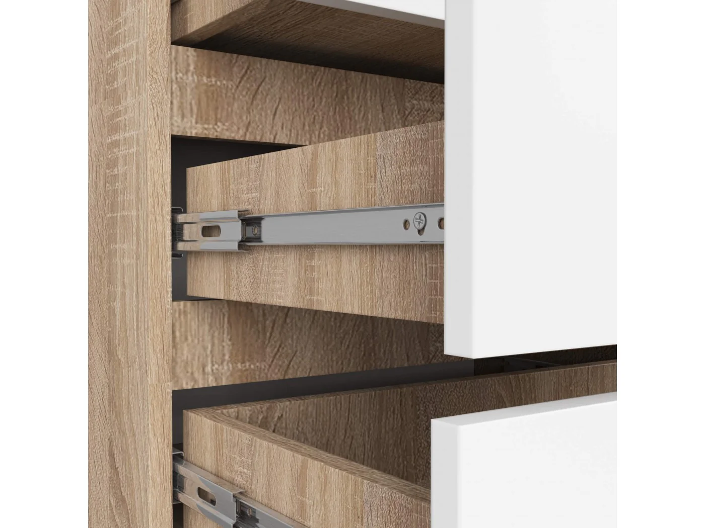 Dwukolorowa szafka nocna to funkcjonalny dodatek do każdej sypialni. Jasny odcień dębu sonoma w połączeniu z białymi frontami szuflad sprawia, że komoda ta idealnie sprawdzi się w minimalistycznych wnętrzach w stylu skandynawskim, ale z powodzeniem rozjaśni też bardziej tradycyjne pomieszczenia, dodając im lekkości i nowoczesnego charakteru.