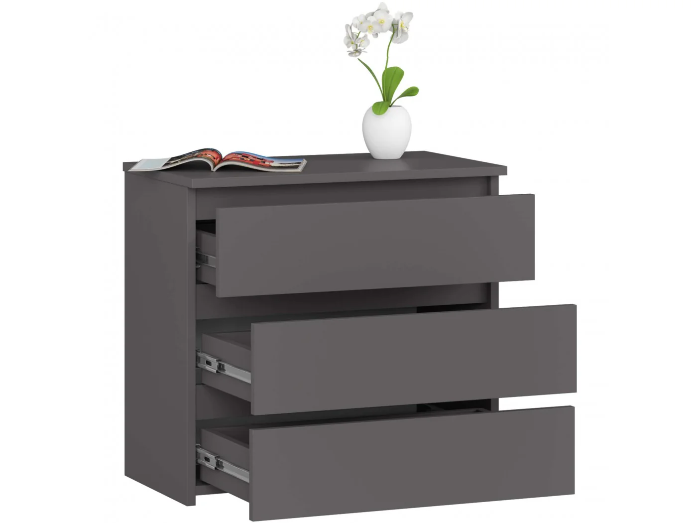 Komoda grafit szary posiada 3 wygodnie otwierane szuflady. Znakomicie się sprawdzi do sypialni jako nieodzowny element jej wyposażenia. W szufladach można przechowywać bieliznę, akcesoria kosmetyczne czy komplet pościeli na zmianę. Blat idealnie się nada do ustawienia lampki nocnej i położenia zajmującej lektury. Mebel można postawić także w pokoju dziecka i w sypialni nastolatka.