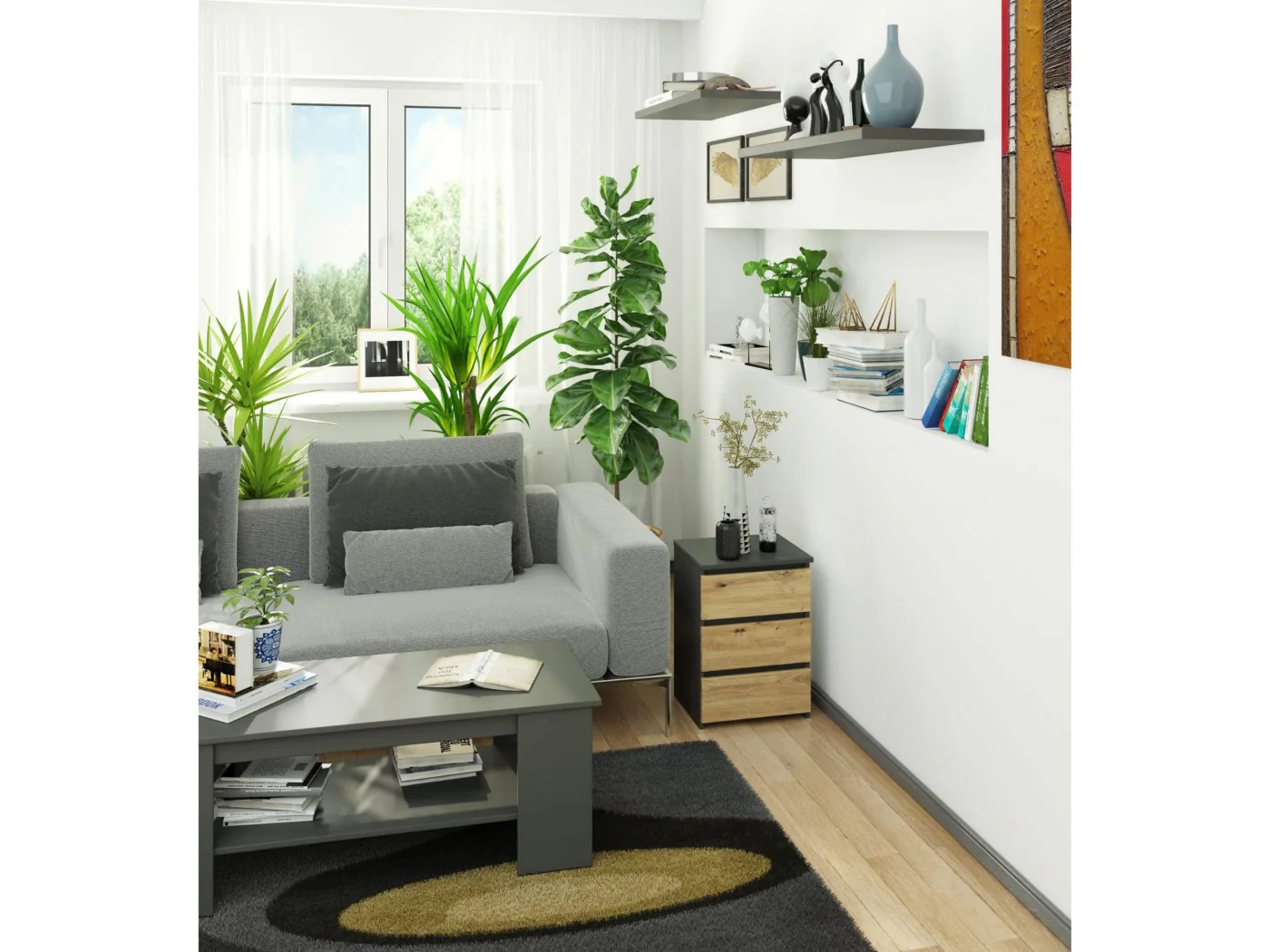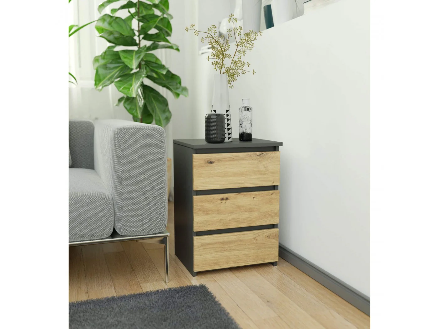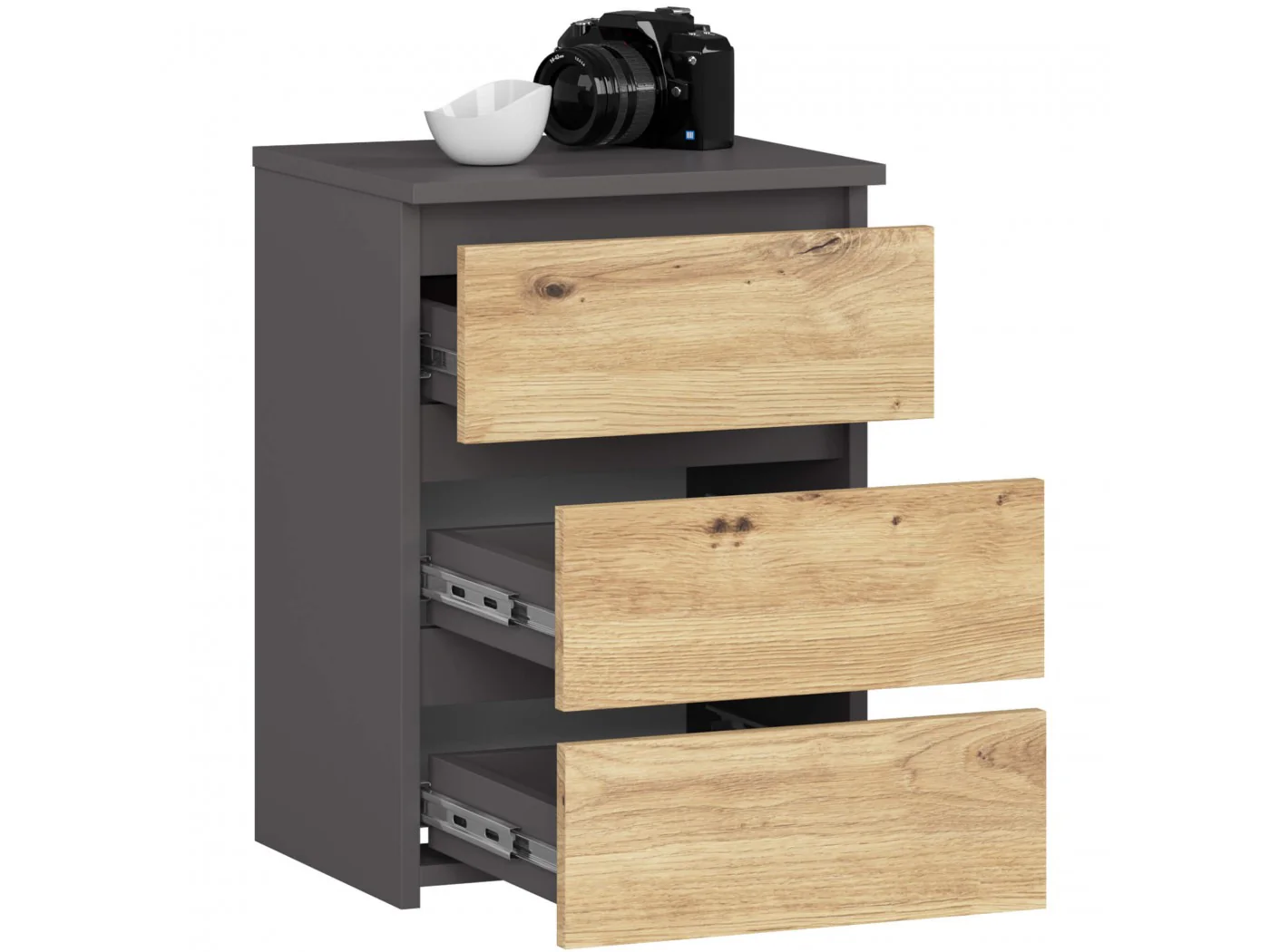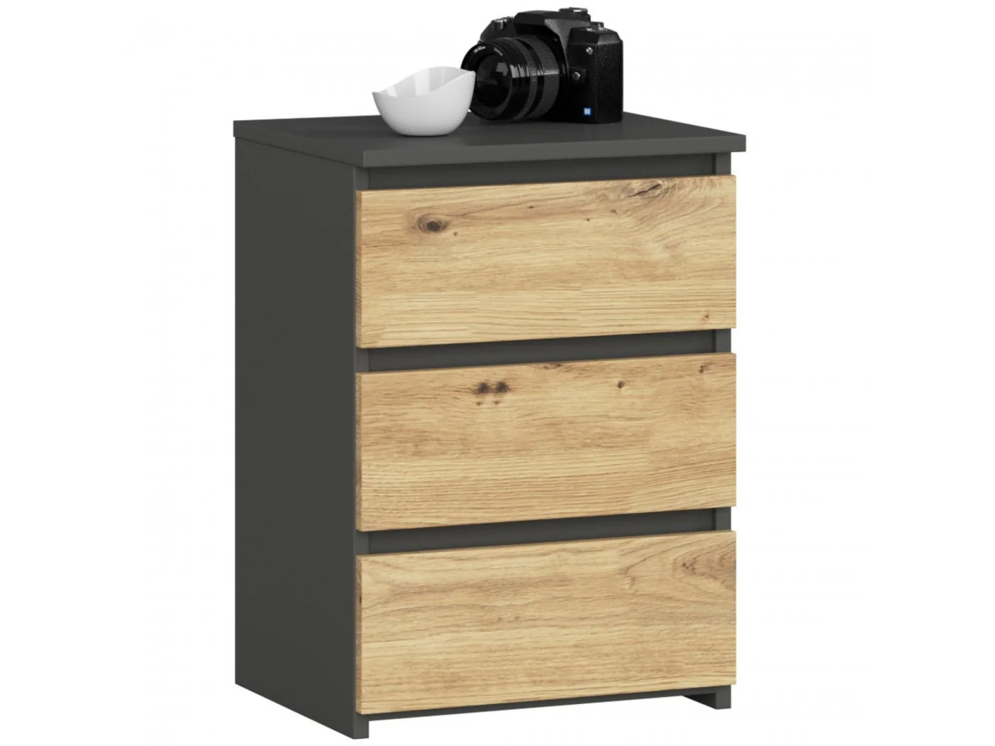 - elegancki wygląd - komoda jest prosta w formie, cechuje się stylowym kolorem grafit szary i frontem dąb artisan,