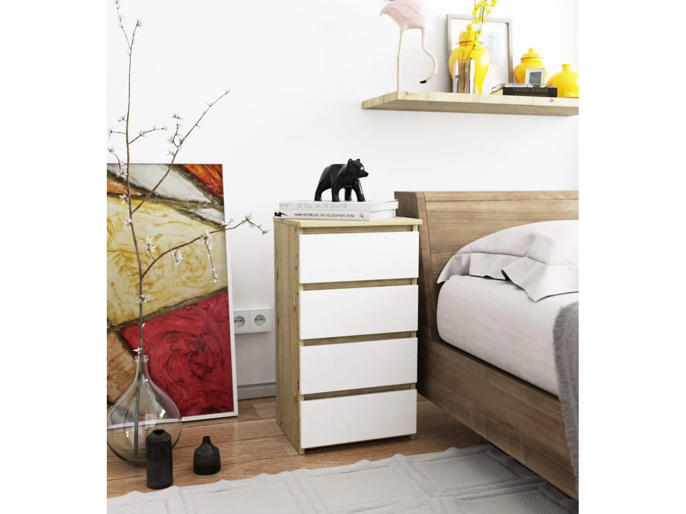 Komody to popularny typ mebla, który umieszcza się przy łóżku. Na jego blacie najczęściej znajduje się lampka, zaś wewnątrz przedmioty ułatwiające odpoczynek oraz sen. Osoby, które szukają eleganckiej komody, powinny zwrócić uwagę na komodę CL4 40 cm w kolorze dąb artisan biała. Będzie się ona pięknie prezentować w każdej sypialni. Postawić można ją również w pokoju dziecięcym.
