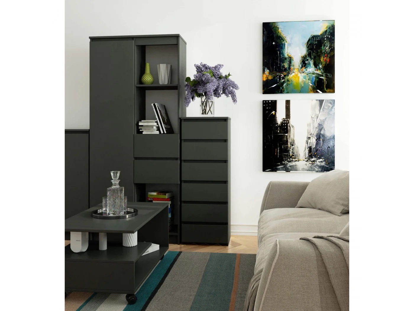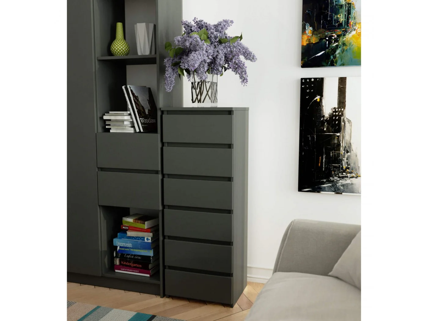 - elegancki wygląd - komoda jest prosta w formie, cechuje się stylowym kolorem grafit szary,