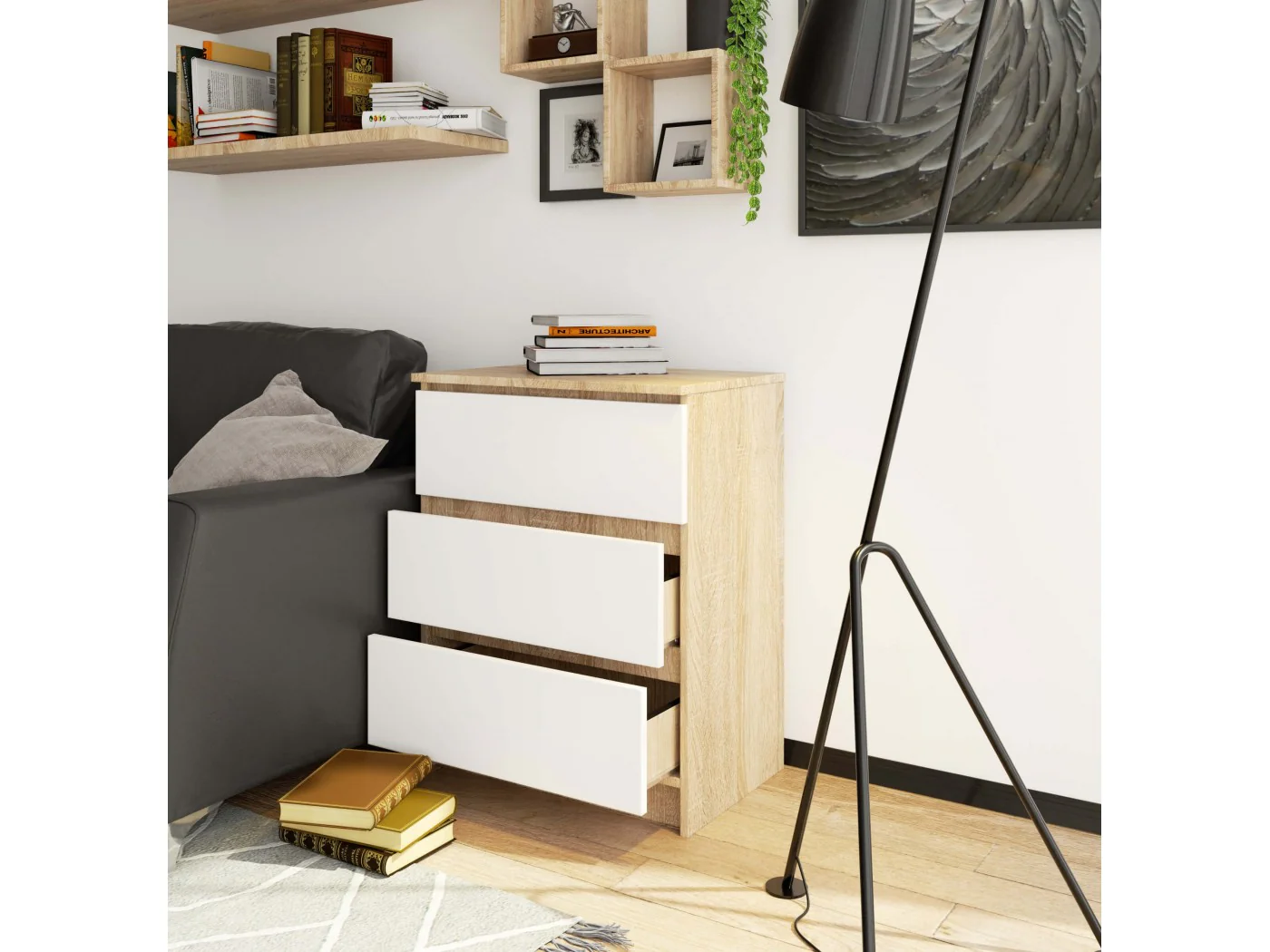 Przedstawiamy komodę K60 - praktyczny mebel, który swoją wysoką funkcjonalność zawdzięcza przede wszystkim trzem pojemnym szufladom. Oryginalny, nowoczesny design i połączenie klasycznej bieli z modnym i gustownym kolorem dąb sonoma sprawia, że szafka ta znakomicie sprawdzi się w sypialni, przedpokoju czy salonie, a także będzie świetnym elementem wyposażenia pomieszczeń biurowych.