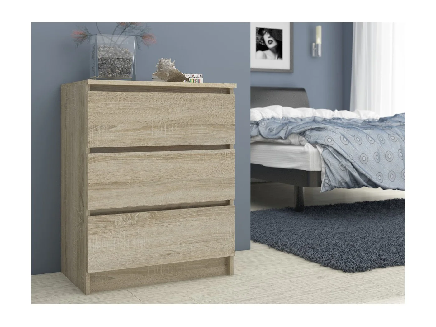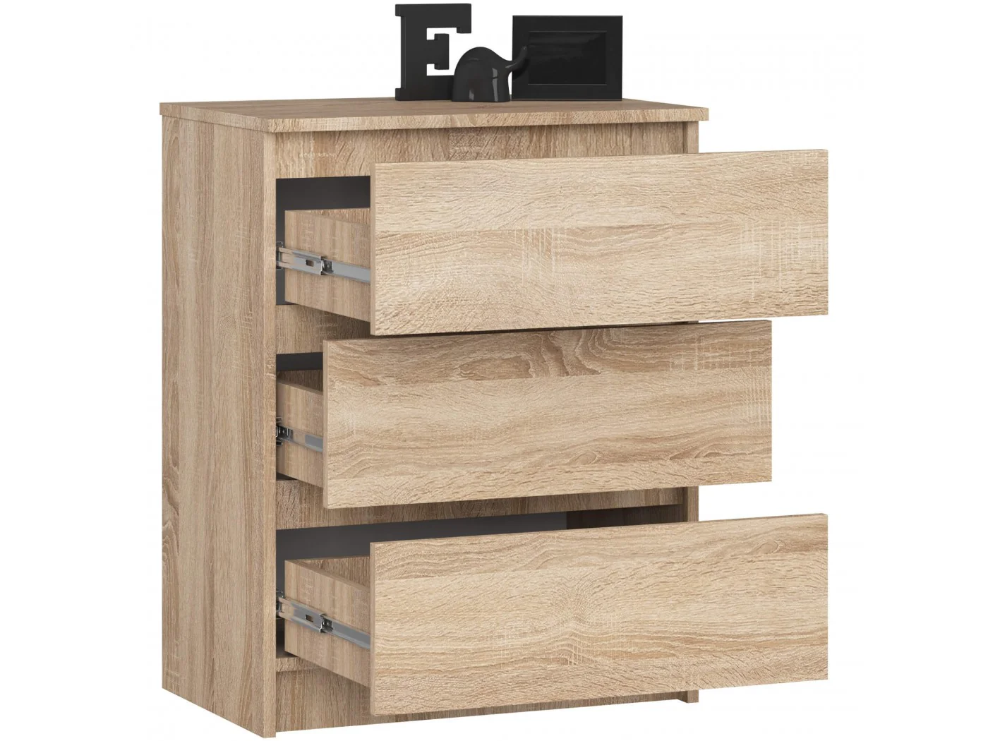 Niewielka lecz pojemna komoda z trzema szufladami, której wykończenie spełni oczekiwania wymagających. Wykorzystano tutaj dąb sonomę, barwę idealnie pasującą do jasnych wykończeń wnętrz. Produkt trafi do sypialni, salonu, pokoju czy przedpokoju - wszystko zależy od potrzeb naszych klientów. Proponujemy egzemplarz wykonany z płyty laminowanej o grubości aż 16 milimetrów. Jest to materiał odporny na ścieranie, który dodatkowo wzmocnionono obiciem ABS na obrzeżach. W modelu zastosowano szuflady poruszające się na metalowych prowadnicach kulkowych, co przekłada się na płynne, delikatne i precyzyjne działanie.
