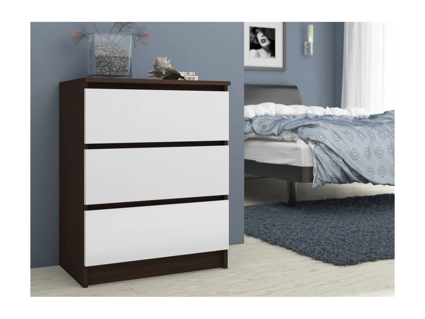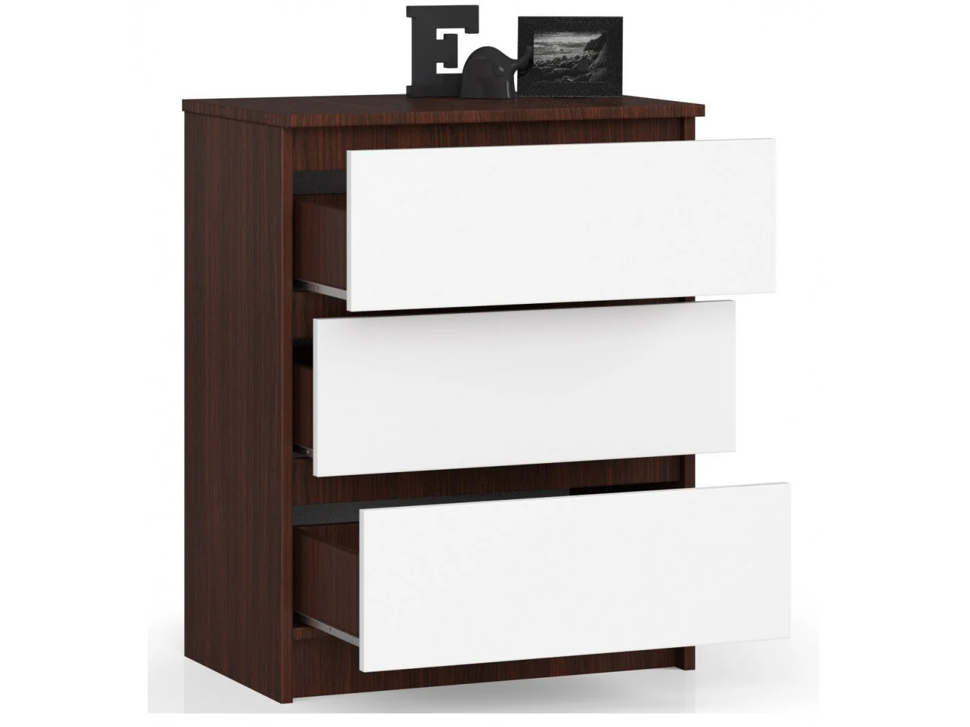 Komoda to niezwykle praktyczny mebel, który doskonale sprawdzi się w każdym domu. Bez względu na wielkość i charakter pomieszczenia, niezależnie od stylu jego aranżacji, komody świetnie sprawdzą się do przechowywania wszelkich niezbędnych artykułów. Nasza oferta obejmuje dobre gatunkowo oraz dostępne w korzystnych cenach mebel, wśród których klienci mogą liczyć na efektowne, funkcjonalne komody wykonane z laminowanej płyty o grubości 16 milimetrów - materiału wykazującego dużą odporność na zarysowania oraz uszkodzenia. Przygotowana propozycja to komoda składająca się z trzech szuflad, utrzymana w odcieniu wenge połączonym z nieśmiertelnie piękną bielą. Ciekawie zaprojektowany element wyposażenia znajdzie zastosowanie nie tylko w mieszkaniu, ale także w biurze. Gwarantujemy wysoką jakość oraz atrakcyjną cenę.