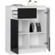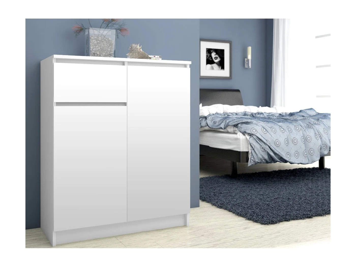 Nowoczesna biała komoda z szufladą oraz pojemnymi półkami to propozycja kierowana do osób preferujących prosty, ale jednocześnie efektowny styl skandynawski. Jest to mebel wysokiej jakości, który z uwagi na swoje walory wizualne jest chętnie wybierany przez odwiedzających nas klientów. Biała komoda została utrzymana w modnej i uniwersalnej kolorystyce. Na uwagę zasługuje również staranne wykonanie oraz solidna konstrukcja, która jest gwarantem trwałości prezentowanego mebla. Komoda 80cm znajdzie zastosowanie w każdym pomieszczeniu - hotelowym, biurowym czy mieszkalnym. Bardzo dobrze będzie prezentowała się na przykład w sypialni, salonie, jadalni czy pokoju młodzieżowym. Proponujemy Państwu atrakcyjną cenę produktu, który na pewno przypadnie Państwu do gustu i pomoże stworzyć niepowtarzalny klimat w każdym urządzanym modnie wnętrzu. Mebel wykonano z płyty laminowanej (grubość 16 milimetrów), która wykazuje bardzo dobrą odporność na ścieranie. Krawędzie zostały oklejone obrzeżem ABS.
