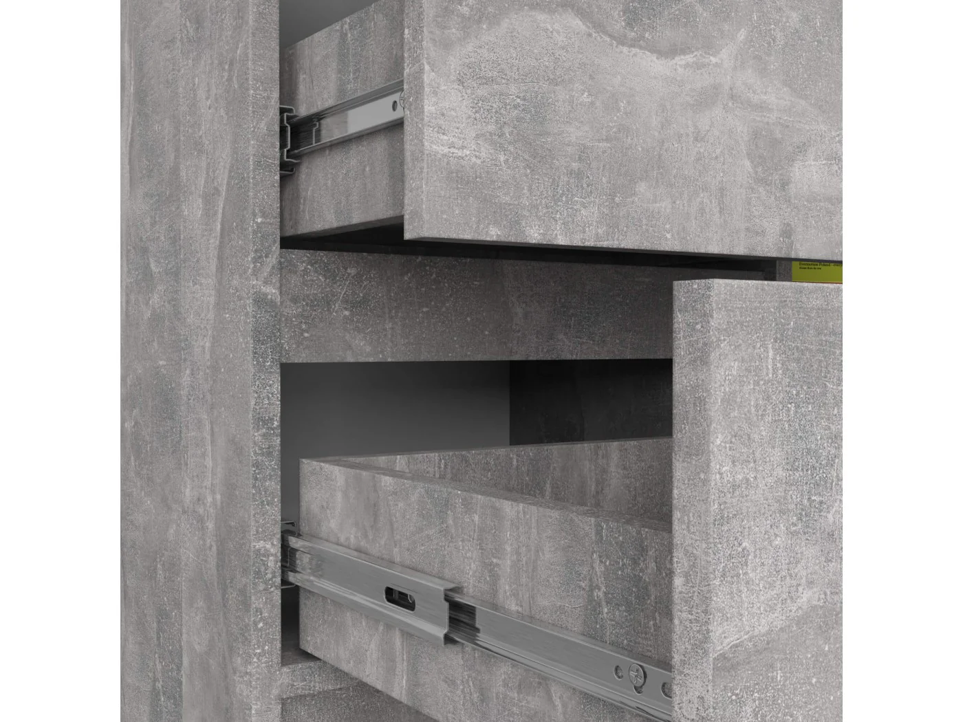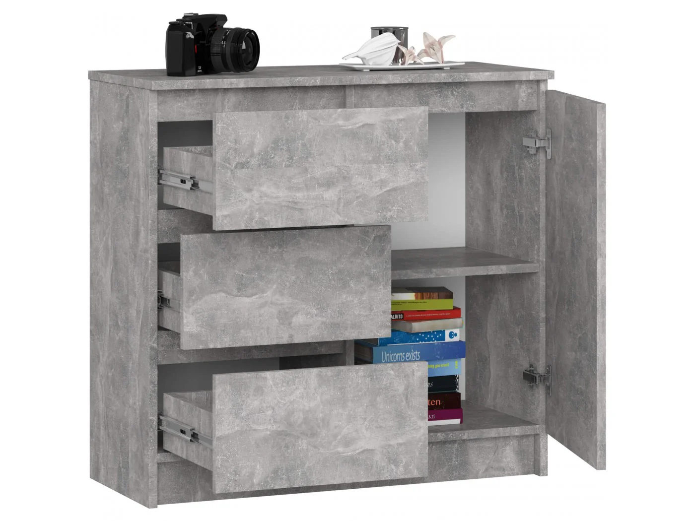 Niewielka komoda to element wyposażenia, który znajdzie zastosowanie w każdym pomieszczeniu. Nowoczesne barwy, solidna konstrukcja i staranne wykonanie zaowocowało powstaniem szafki, która sprawdzi się na przykład w przedpokoju, pokoju dziennym czy młodzieżowym, a także w sypialni. Może być wykorzystana również w pomieszczeniu biurowym, gdzie umożliwi przechowywanie licznych dokumentów oraz innych artykułów o charakterze biurowym. Komoda składa się z jednych drzwiczek (w środku znajdują się dwie półki) oraz 3 szuflad. Mebel łączy w sobie kolorystykę betonu.