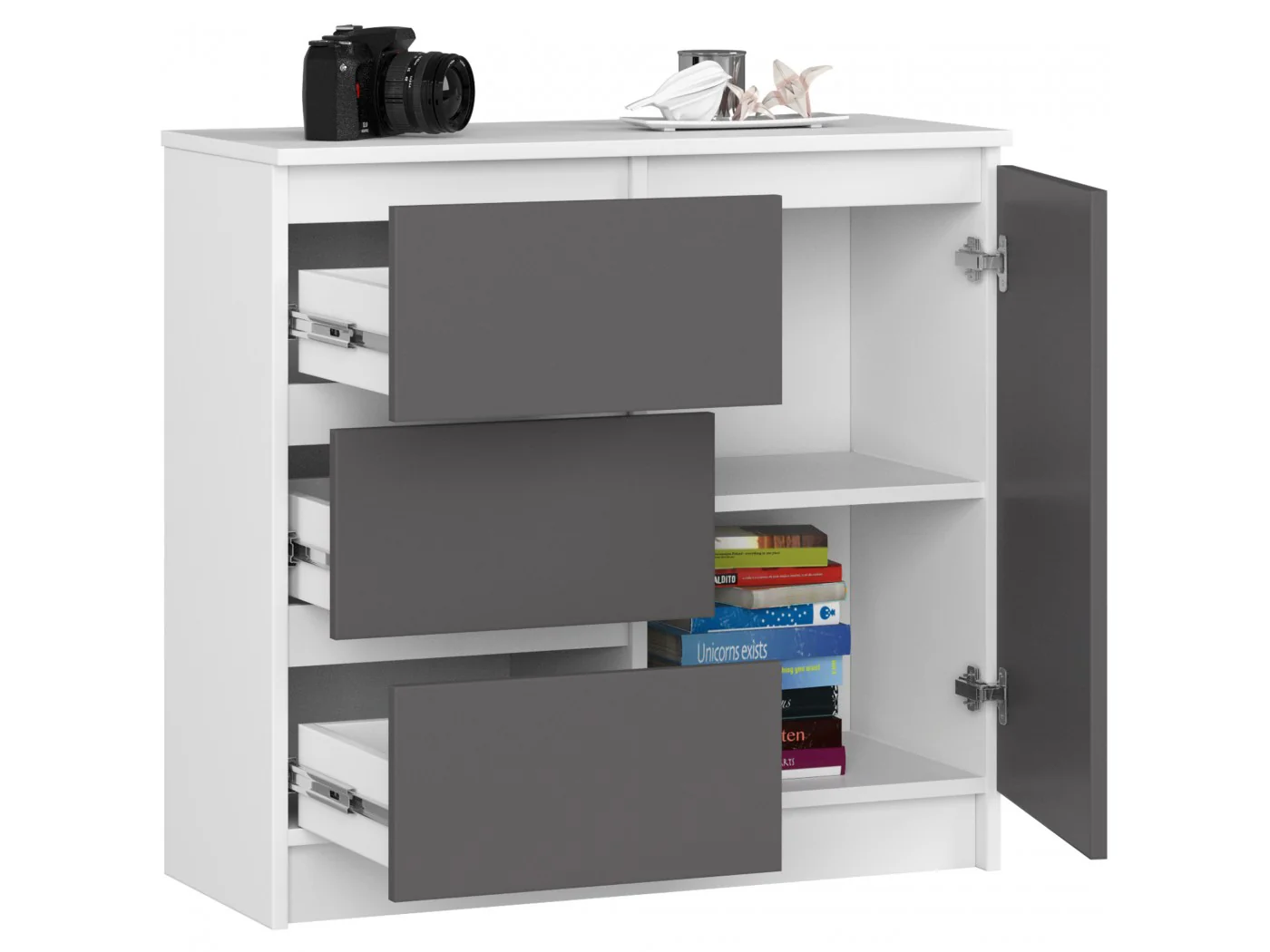 Niewielka komoda to element wyposażenia, który znajdzie zastosowanie w każdym pomieszczeniu. Nowoczesne barwy, solidna konstrukcja i staranne wykonanie zaowocowało powstaniem szafki, która sprawdzi się na przykład w przedpokoju, pokoju dziennym czy młodzieżowym, a także w sypialni. Może być wykorzystana również w pomieszczeniu biurowym, gdzie umożliwi przechowywanie licznych dokumentów oraz innych artykułów o charakterze biurowym. Komoda składa się z jednych drzwiczek (w środku znajdują się dwie półki) oraz 3 szuflad. Mebel łączy w sobie kolorystykę biała i grafit szary.