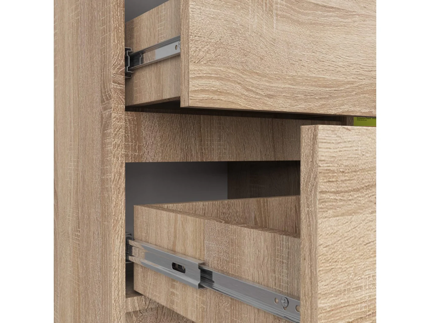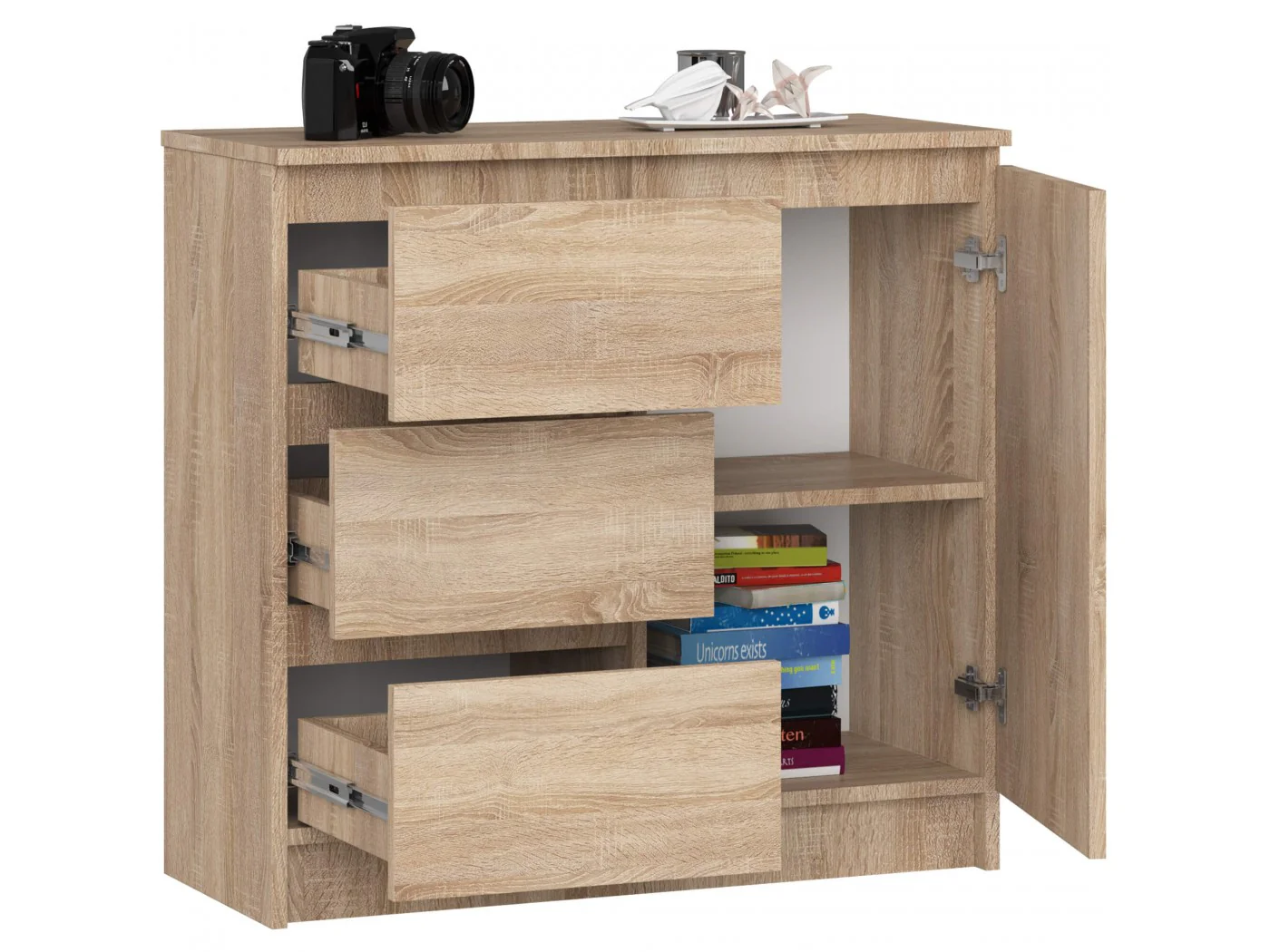 Niewielka komoda to element wyposażenia, który znajdzie zastosowanie w każdym pomieszczeniu. Nowoczesne barwy, solidna konstrukcja i staranne wykonanie zaowocowało powstaniem szafki, która sprawdzi się na przykład w przedpokoju, pokoju dziennym czy młodzieżowym, a także w sypialni. Może być wykorzystana również w pomieszczeniu biurowym, gdzie umożliwi przechowywanie licznych dokumentów oraz innych artykułów o charakterze biurowym. Komoda składa się z jednych drzwiczek (w środku znajdują się dwie półki) oraz 3 szuflad. Mebel łączy w sobie kolorystykę dąb sonoma.