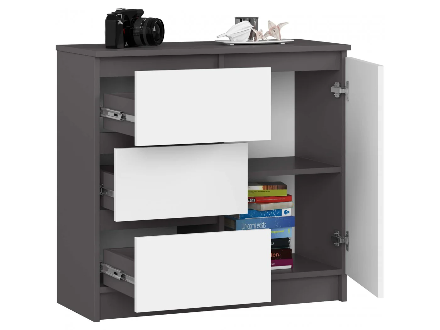 Niewielka komoda to element wyposażenia, który znajdzie zastosowanie w każdym pomieszczeniu. Nowoczesne barwy, solidna konstrukcja i staranne wykonanie zaowocowało powstaniem szafki, która sprawdzi się na przykład w przedpokoju, pokoju dziennym czy młodzieżowym, a także w sypialni. Może być wykorzystana również w pomieszczeniu biurowym, gdzie umożliwi przechowywanie licznych dokumentów oraz innych artykułów o charakterze biurowym. Komoda składa się z jednych drzwiczek (w środku znajdują się dwie półki) oraz 3 szuflad. Mebel łączy w sobie kolorystykę grafit szary i bieli.