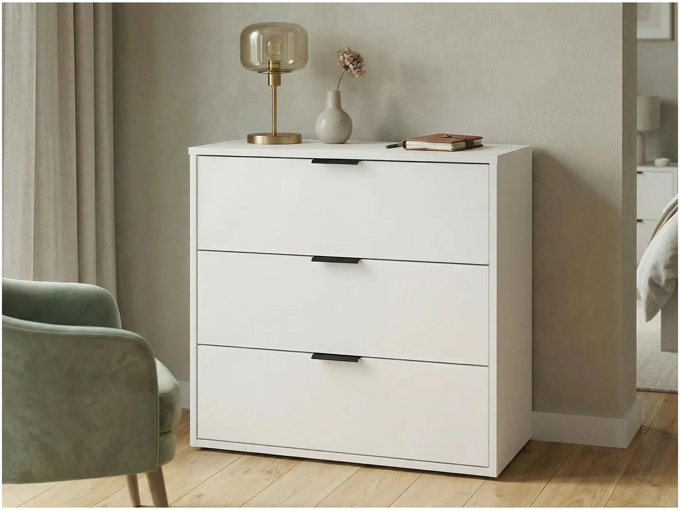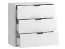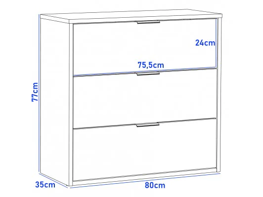 Mebel został zaprojektowany z myślą o codziennym komforcie użytkowania. Trzy pojemne szuflady zapewniają dużo miejsca do przechowywania ubrań, dokumentów, akcesoriów czy domowych drobiazgów. Kompaktowe wymiary sprawiają, że komoda świetnie sprawdzi się zarówno w większych, jak i mniejszych pomieszczeniach.