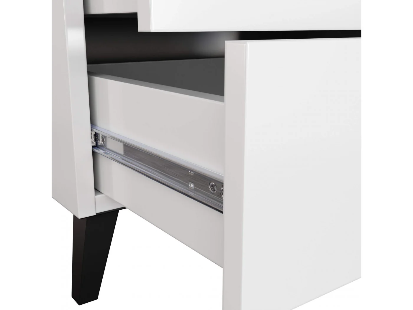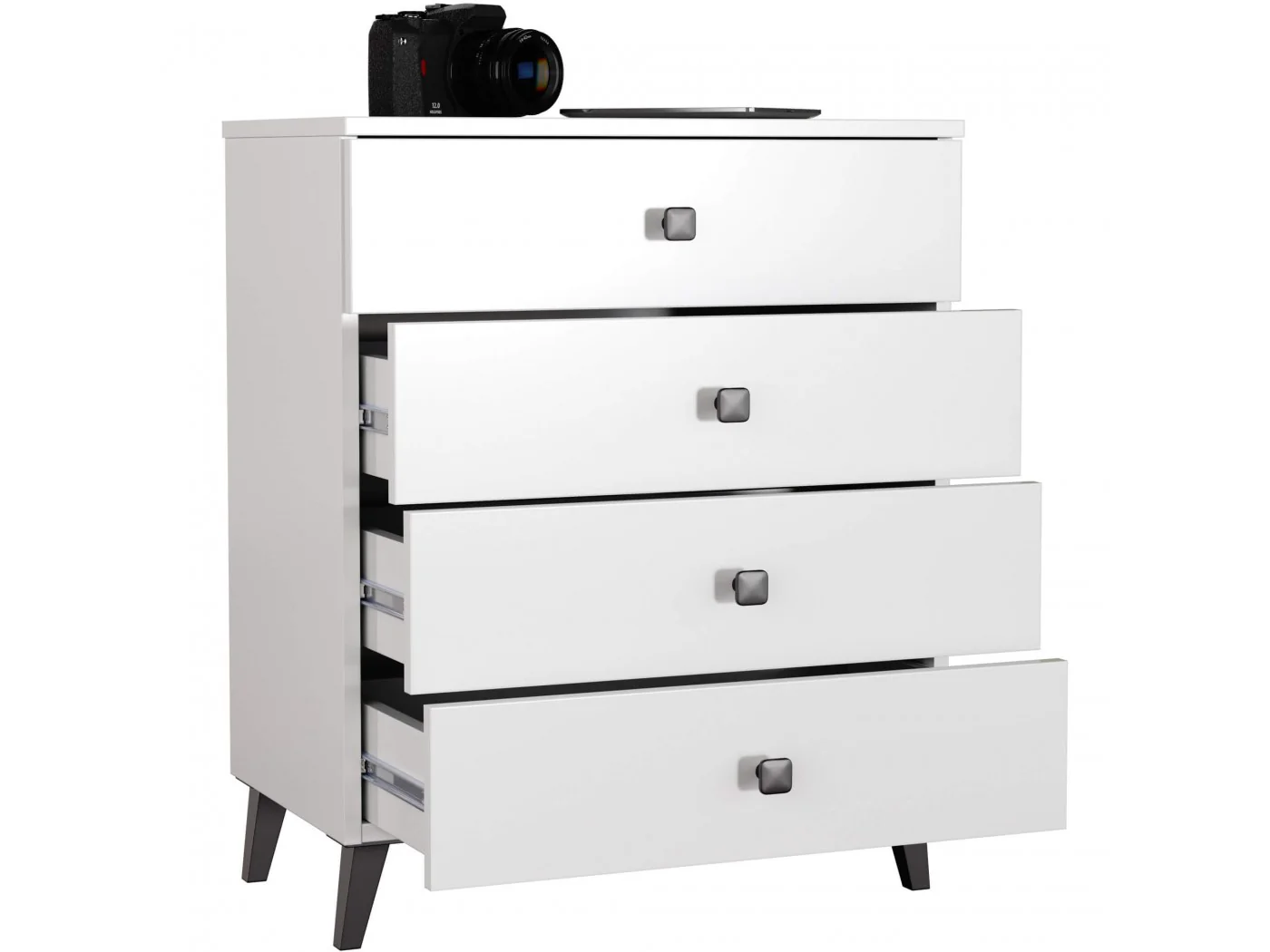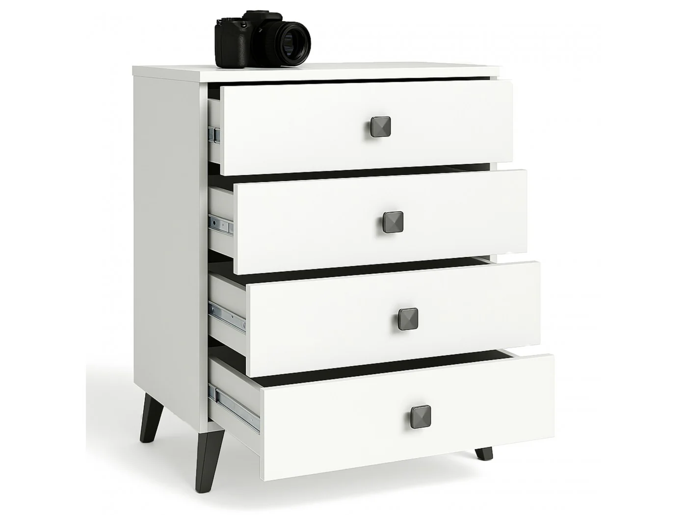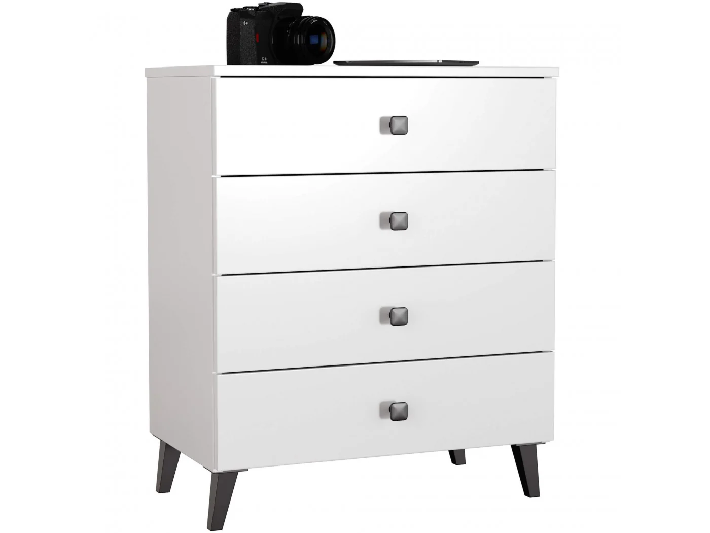 Niewielka komoda to element wyposażenia, który znajdzie zastosowanie w każdym pomieszczeniu. Nowoczesne barwy, solidna konstrukcja i staranne wykonanie zaowocowało powstaniem szafki, która sprawdzi się na przykład w przedpokoju, pokoju dziennym czy młodzieżowym, a także w sypialni. Może być wykorzystana również w pomieszczeniu biurowym, gdzie umożliwi przechowywanie licznych dokumentów oraz innych artykułów o charakterze biurowym. Komoda składa się z 4 szuflad. Mebel łączy w sobie kolorystykę białą i czarną.