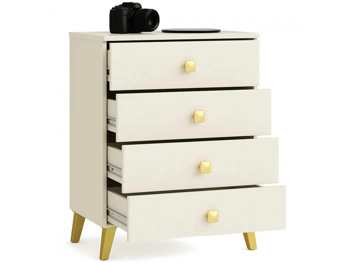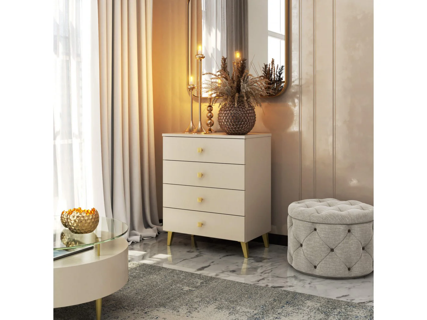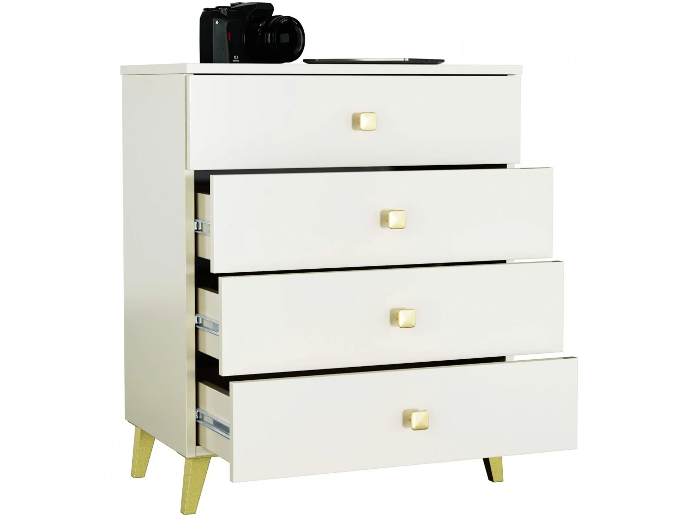 Niewielka komoda to element wyposażenia, który znajdzie zastosowanie w każdym pomieszczeniu. Nowoczesne barwy, solidna konstrukcja i staranne wykonanie zaowocowało powstaniem szafki, która sprawdzi się na przykład w przedpokoju, pokoju dziennym czy młodzieżowym, a także w sypialni. Może być wykorzystana również w pomieszczeniu biurowym, gdzie umożliwi przechowywanie licznych dokumentów oraz innych artykułów o charakterze biurowym. Komoda składa się z 4 szuflad. Mebel łączy w sobie kolorystykę kaszmir i złoty.