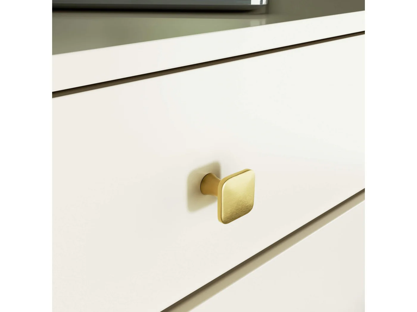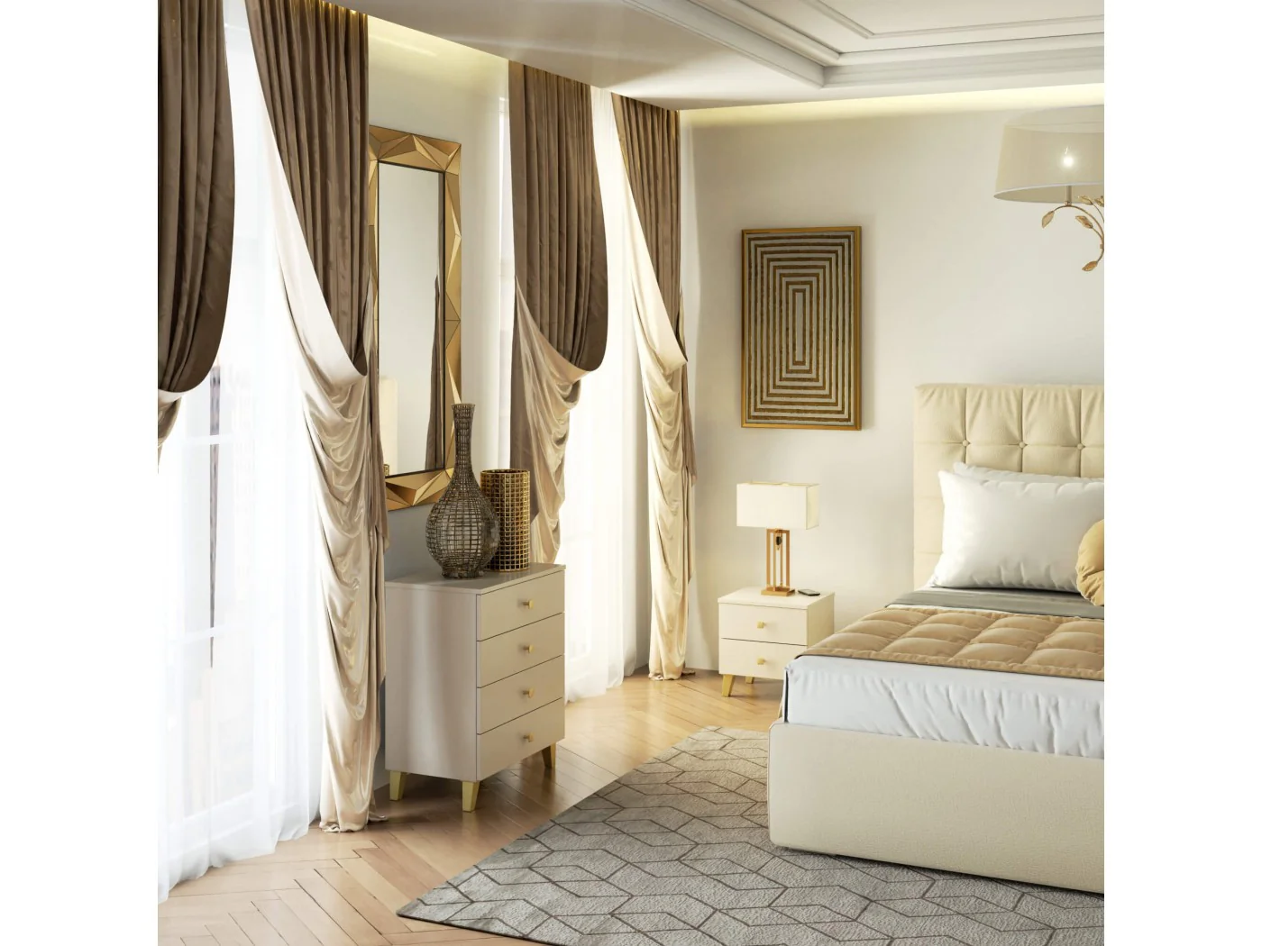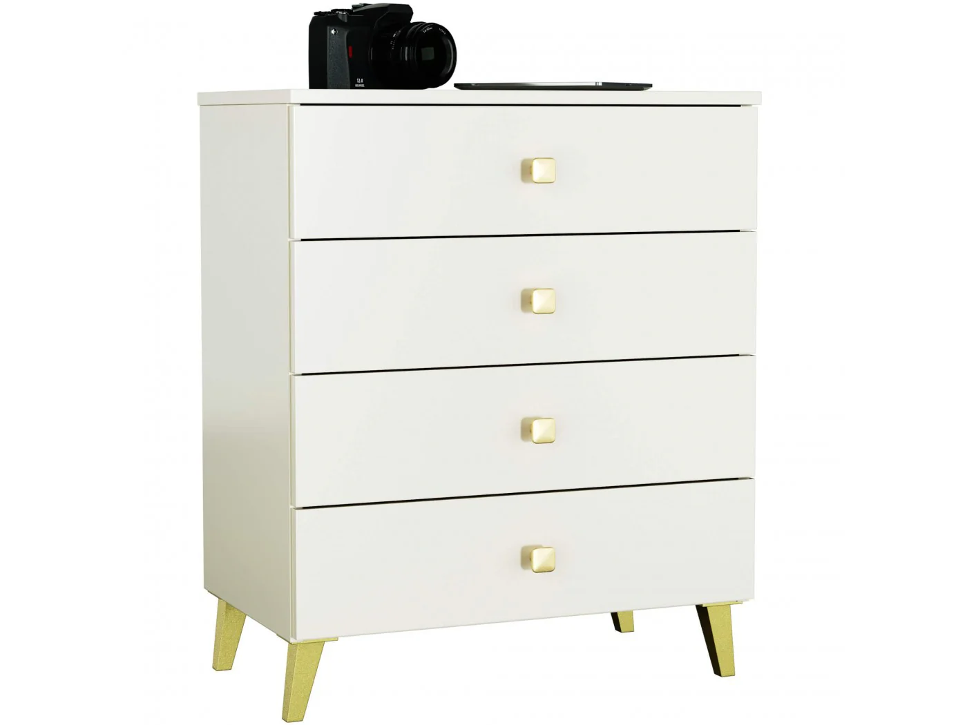 Niewielka komoda to element wyposażenia, który znajdzie zastosowanie w każdym pomieszczeniu. Nowoczesne barwy, solidna konstrukcja i staranne wykonanie zaowocowało powstaniem szafki, która sprawdzi się na przykład w przedpokoju, pokoju dziennym czy młodzieżowym, a także w sypialni. Może być wykorzystana również w pomieszczeniu biurowym, gdzie umożliwi przechowywanie licznych dokumentów oraz innych artykułów o charakterze biurowym. Komoda składa się z 4 szuflad. Mebel łączy w sobie kolorystykę kaszmir i złoty.