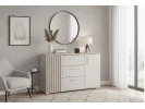 Wykonane z wysokiej jakości tworzywa uchwyty są nie tylko solidne, ale także ergonomiczne, co ułatwia otwieranie i zamykanie szuflad oraz drzwi. Prowadnice rolkowe z blokadą gwarantują płynne wysuwanie szuflad i bezpieczeństwo użytkowania. Przestronne szuflady oferują dużo miejsca na ubrania, pościel, akcesoria i dekoracje. Półki o grubości 18 mm zapewniają wytrzymałość i komfort codziennego użytkowania. Stopki meblowe stabilizują mebel i nadają mu elegancki wygląd, zapewniając niezawodne podparcie na każdej powierzchni. Lamele z płyty MDF 18x16 mm łączą estetykę z trwałością, a dzięki technologii niewidocznego montażu połączenia są niemal niewidoczne, co nadaje komodzie minimalistyczny i nowoczesny charakter.